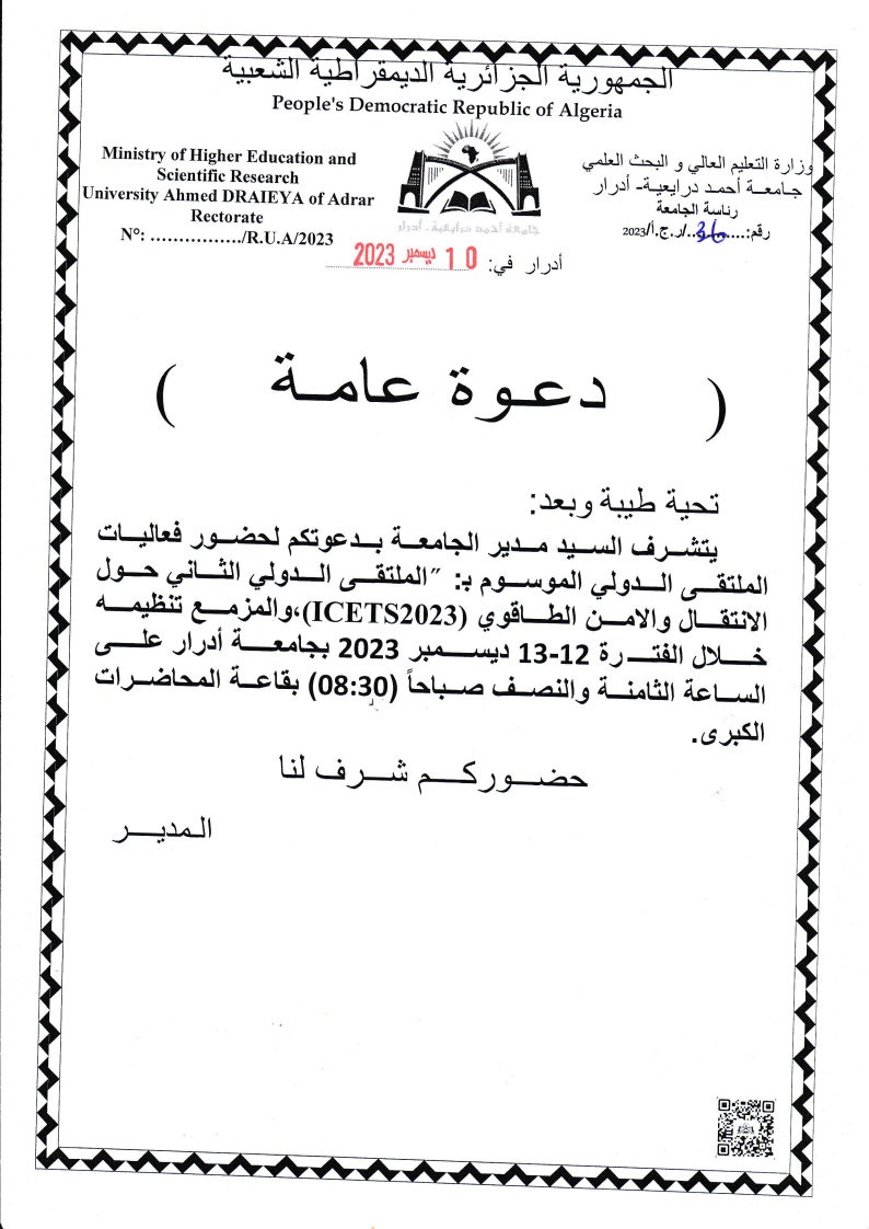 دعوة عامة لحضور فعاليات الملتقى الدولي الثاني حول الانتقال والأمن الطاقوي 568 Share FacebookGoogle+البريد الإلكترونيTwitter