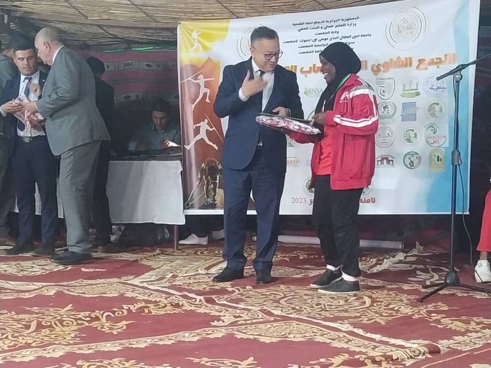 كرمت الطالبة يمينة بن واعلي ممثلة جامعة أحمد درايعية، السنة الثالثة تجارة دولية من طرف وزير التعليم والبحث العلمي السيد كمال بداري بعد حصولها على المرتبة الثالثة في كل من سباق 100 متر ورمي الجلة.