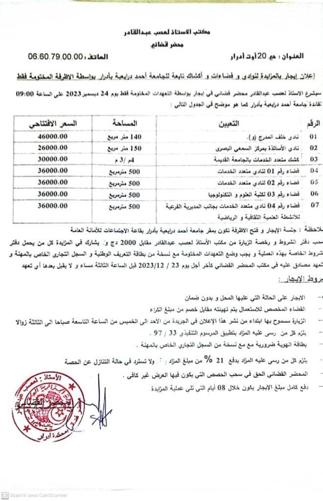 ايجار بالمزايدة لنوادي وفضاءات وأكشاك تابعة لجامعة أحمد درايعية 2٬701 Share FacebookGoogle+البريد الإلكترونيTwitter