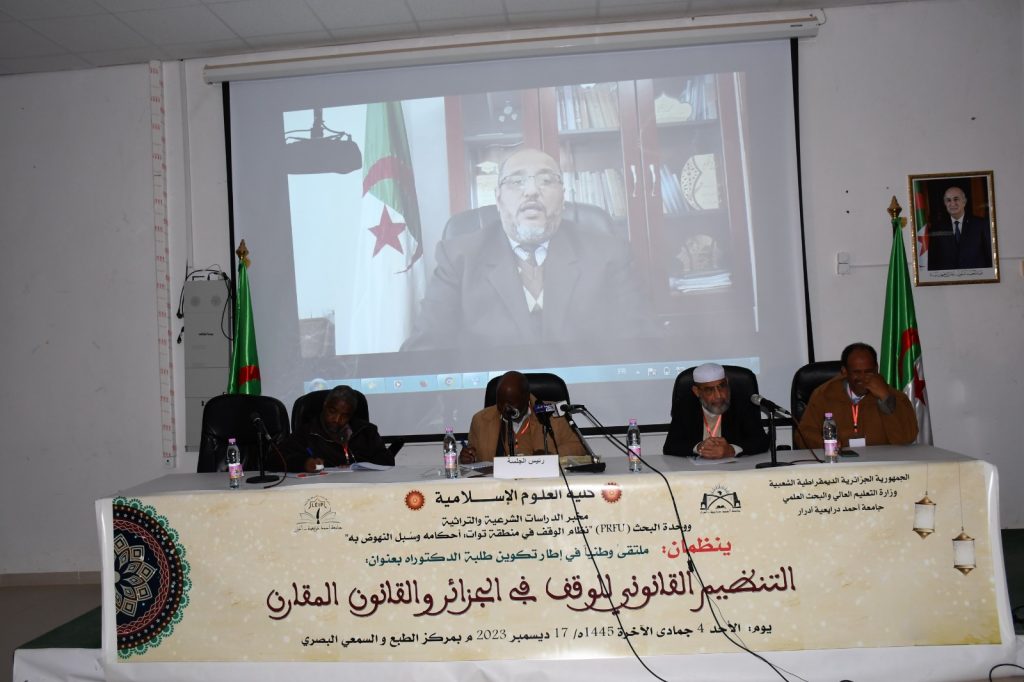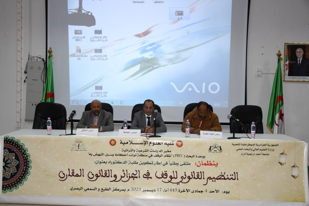 اشرفت كلية العلوم الإسلامية اليوم 17-12-2023 على تنظيم فعاليات الملتقى الوطني الموسوم ” التنظيم القانوني للوقف في الجزائر والقانون المقارن ” ، بالتعاون مع مخبر الدراسات الشرعية والتراثية و ووحدة البحث PRFU ” نظام الوقف في منطقة توات: أحكامه وسبل النهوض به ،فعاليات الملتقى الوطني جرت بحضور ممثلين عن مديرية الشؤون الدينية والاوقاف بولاية ادرار، وعرت مشاركة نوعية ومميزة للأساتذة و الباحثين من جامعة أدرار و من جامعات وطنية عديدة ،كما لقي هذا الملتقى اهتماما واسعا من طلبةالدكتوراه و طلبة الليسانس بكلية الشريعة الإسلامية
