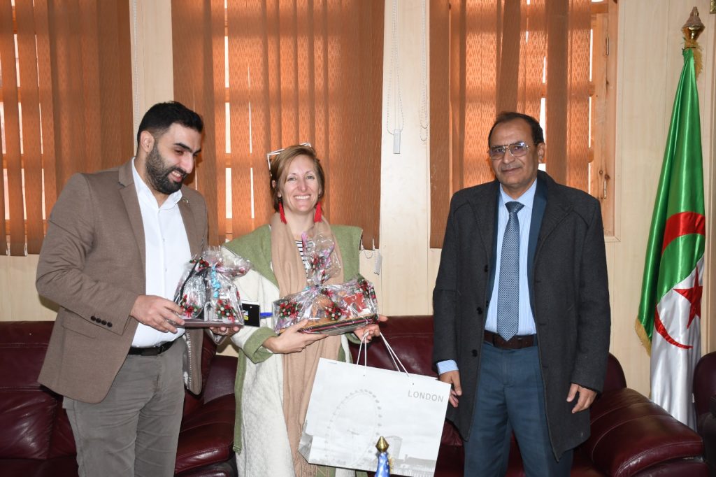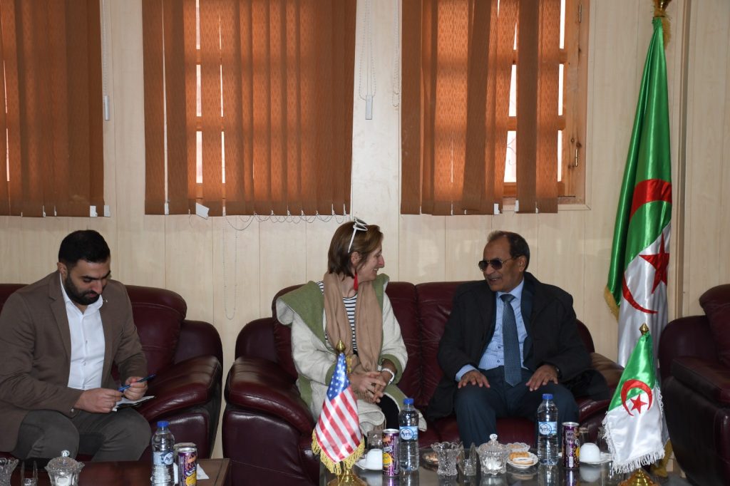 استقبل رئيس جامعة أدرار السيدة ستايسي داوسن الملحق الثقافي بسفارة اللولايات المتحدة رفقة السيد الهاشمي ولد مجبر يوم 19-12-2023 بالقاعة الشرفية للجامعة حيث تطرقا الطرفان للعلاقات التاريخية بين الجزائر والولايات المتحدة في جميع المجلات. وتطرقا إلى سبل التعاون والاستفادة من تقدم الولايات المتحدة في المجلات العلمية والتكنولوجية وعلى وجه الخصوص الطاقات المتجددة المحروقات و الزارعة وفي مجال الابتكار ومرافقة المؤسسات الناشئة بالإضافة إلى تكوين المكونين في اللغة الإنجليزية