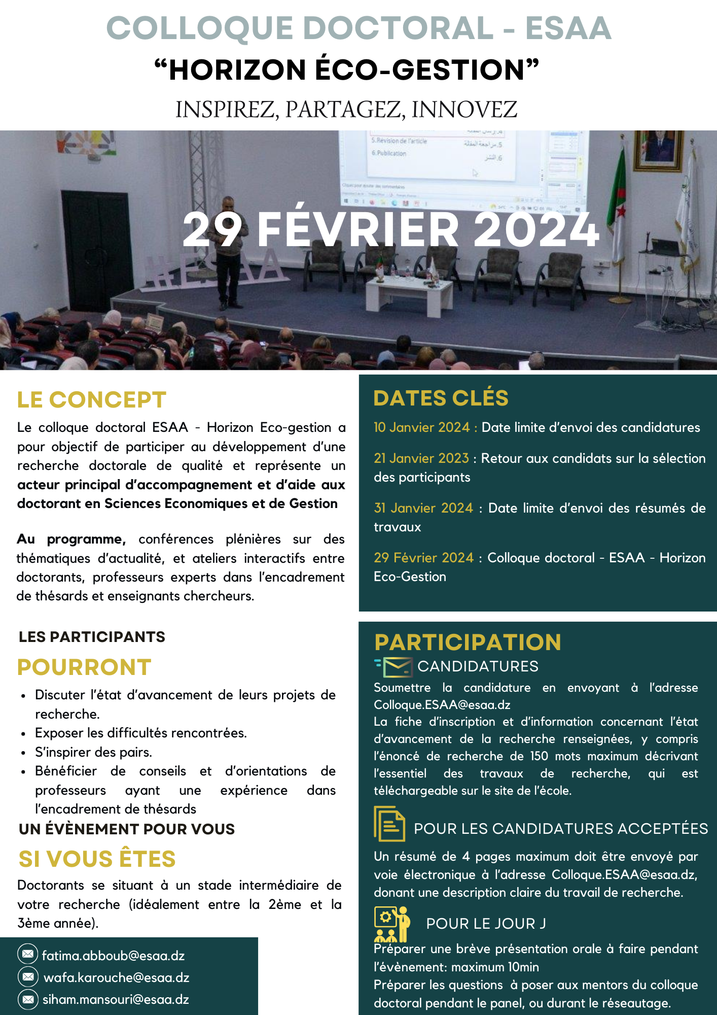 Invitation Colloque Doctoral ESAA Pour télécharger Colloque Doctoral- ESAA – Fiche Récap- Fiche d’inscription Colloque Doctoral ESAA-2024- 1٬161 Share FacebookGoogle+البريد الإلكترونيTwitter