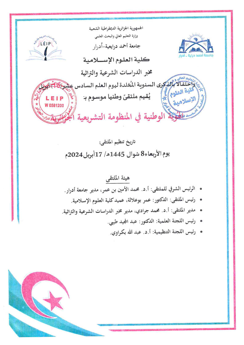 الملتقى الوطني الموسوم بالهوية الوطنية في المنظومة التشريعية الجزائرية للتحميل : الملتقى الوطني الموسوم بالهوية الوطنية في المنظومة التشريعية الجزائرية 2٬951 Share FacebookGoogle+البريد الإلكترونيTwitter
