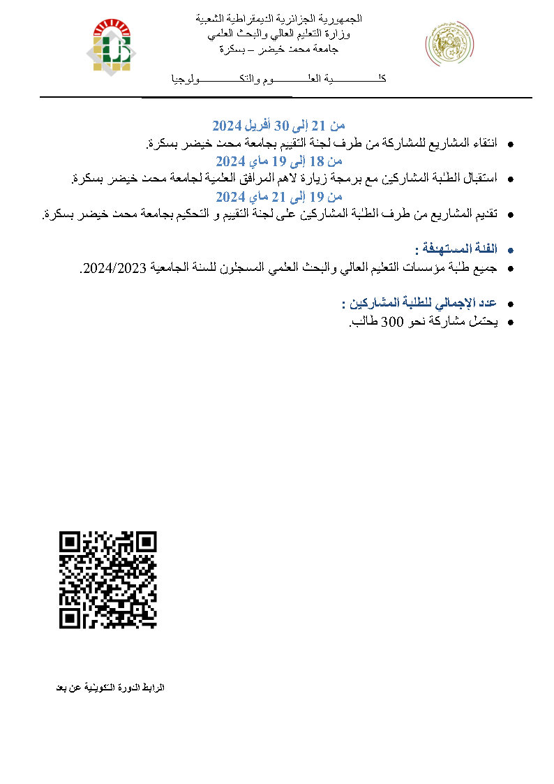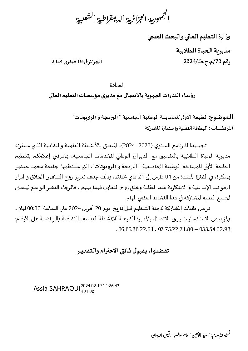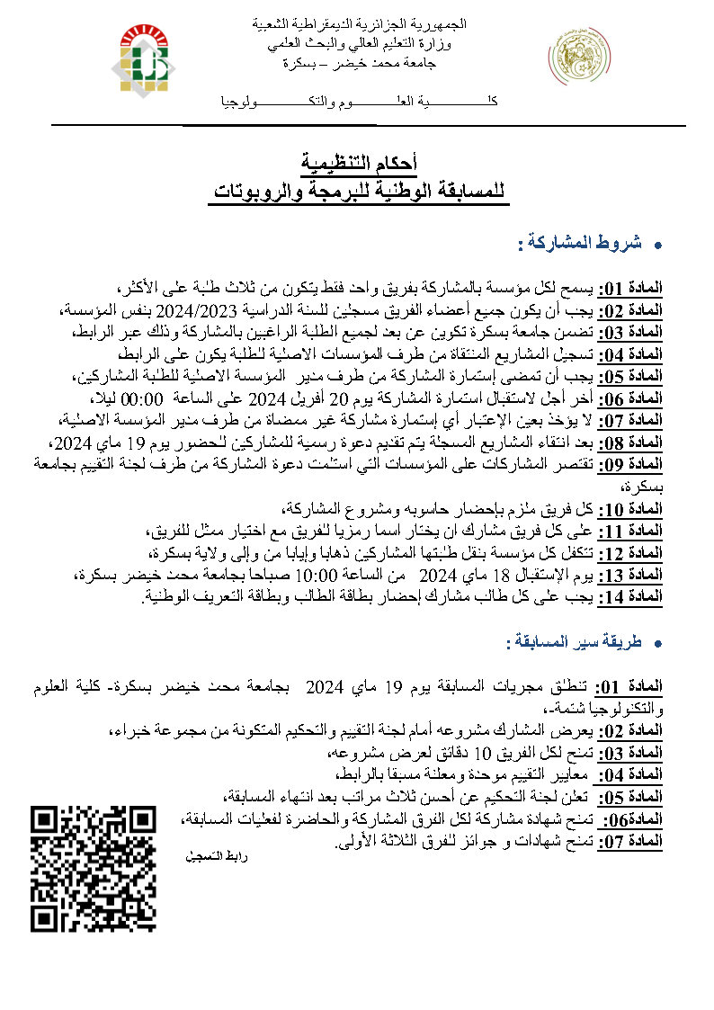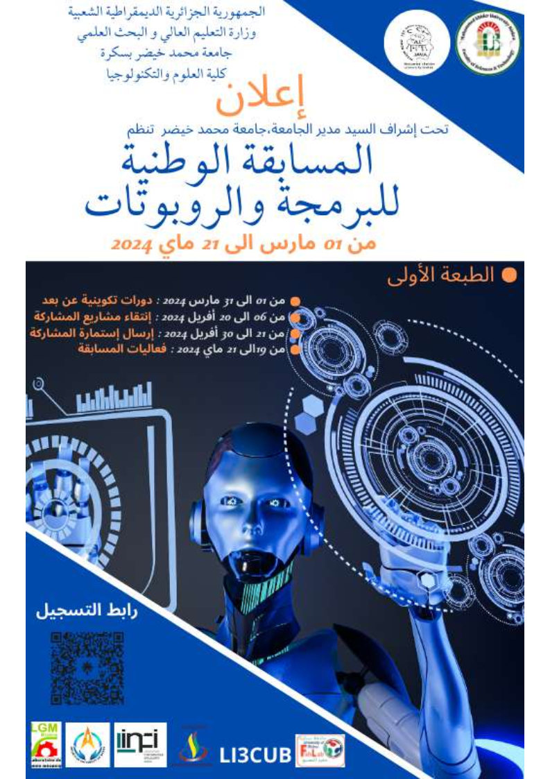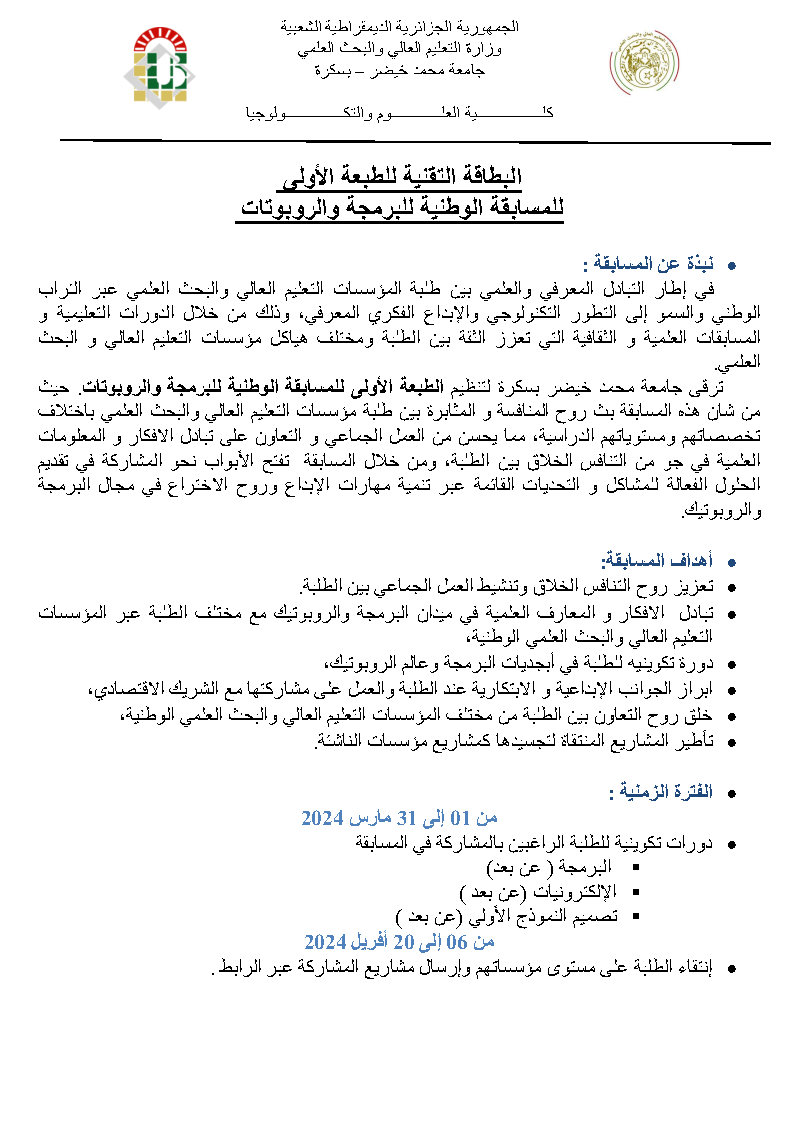 إعلان المسابقة الوطنية للبرمجة والروبوتات من 01 مارس إلى 21 ماي 2024 1٬021 Share FacebookGoogle+البريد الإلكترونيTwitter