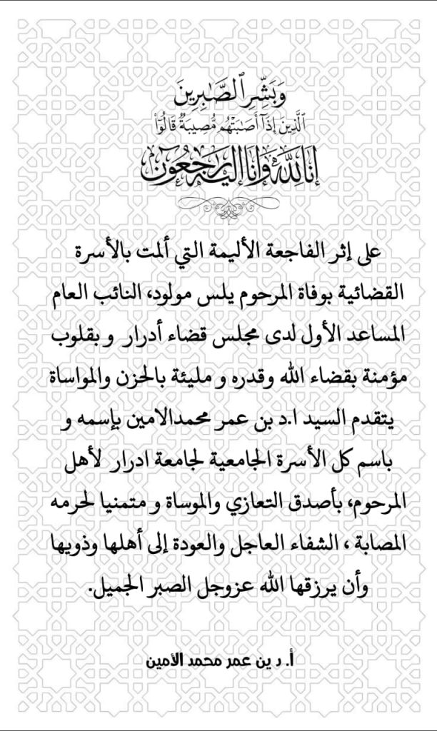 تعزية الى عائلة المرحوم يلس مولود، النائب العام المساعد الأول لدى مجلس قضاء أدرار 790 Share FacebookGoogle+البريد الإلكترونيTwitter