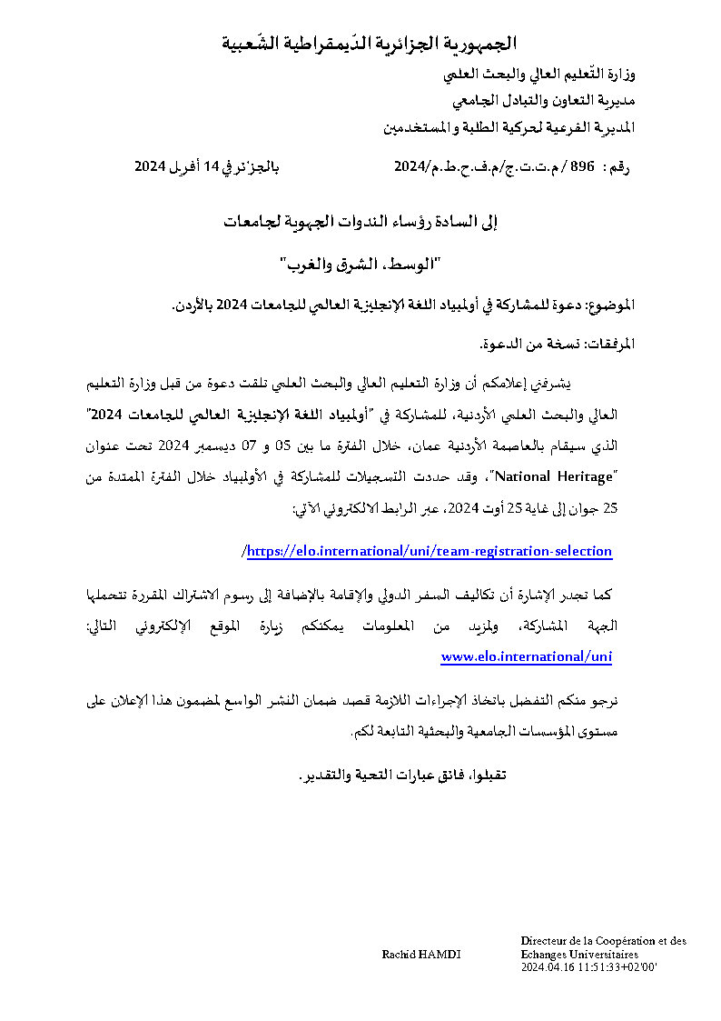 دعوة للمشاركة في أولمبياد اللغة إلانجليزية العالمي للجامعات 2024 بالأردن للتحميل : دليل اشتراك الجامعات الحكومية والخاصة في أولمبياد اللغة الانجليزية العالمي للجامعات 2024 914 Share FacebookGoogle+البريد الإلكترونيTwitter