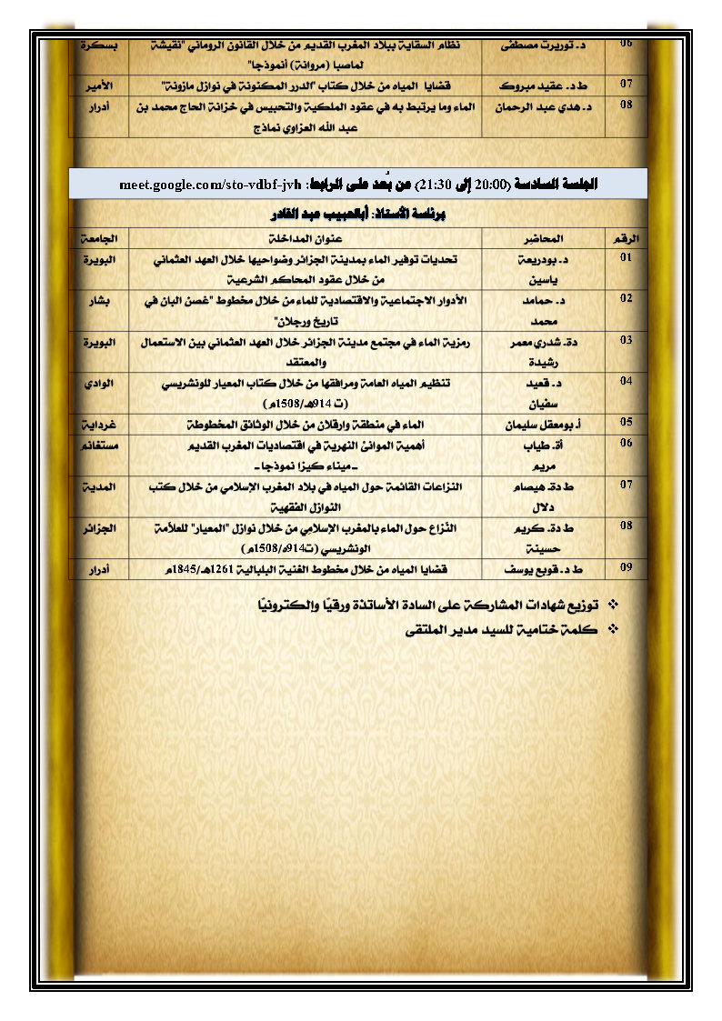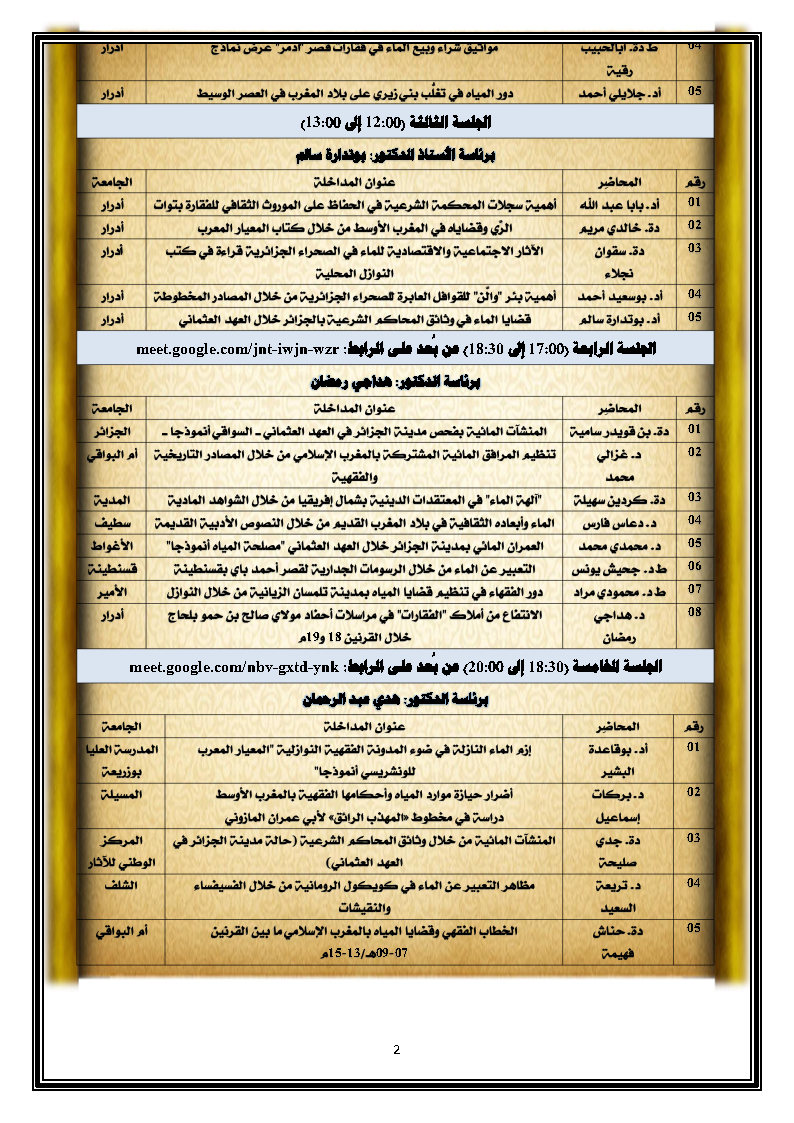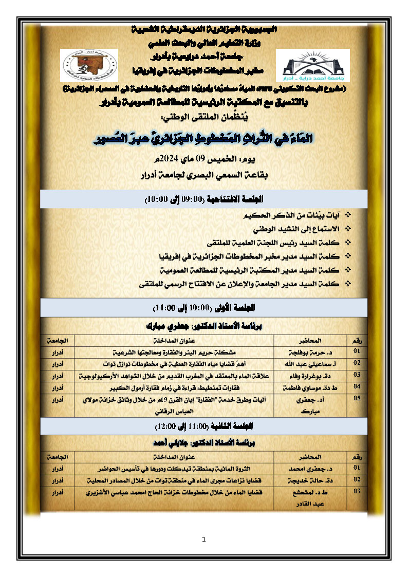 الملتقى الوطني حول الماء في التراث المخطوط الجزائري عبر العصور يوم: الخميس 09 ماي 2024م بقاعة السمعي البصري لجامعة أدرار 1٬363 Share FacebookGoogle+البريد الإلكترونيTwitter