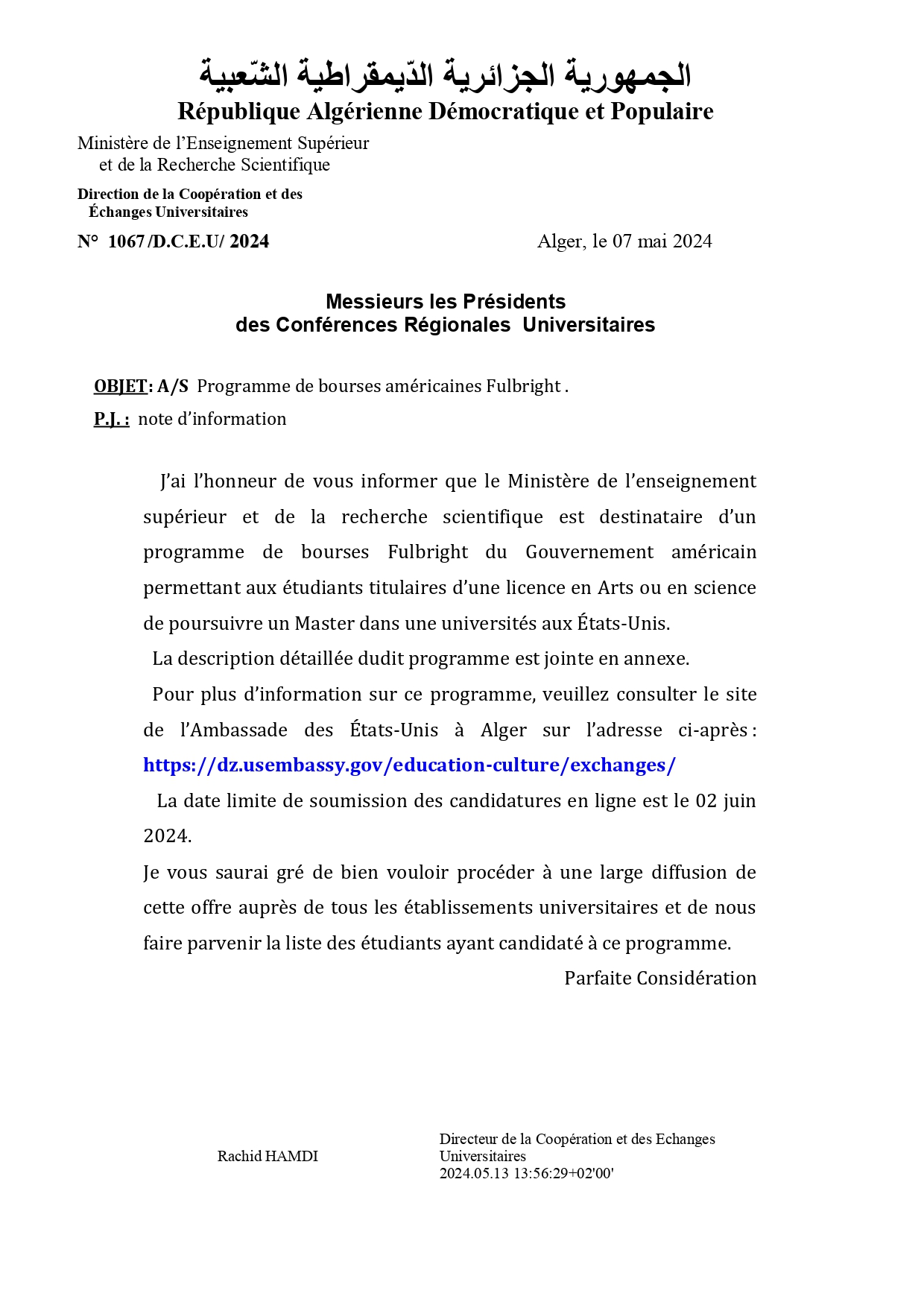 Programme de bourses américaines Fulbright Pour télécharger : 1- Envoi_1067-DCEU_13-5-2024_Fulbright SE 2-fulbright 552 Share FacebookGoogle+البريد الإلكترونيTwitter