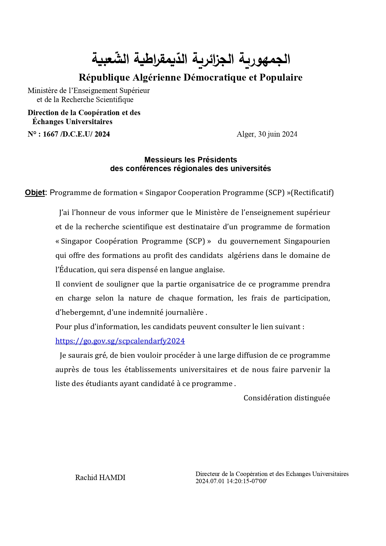 Programme de formation « Singapor Cooperation Programme (SCP) »(Rectificatif) les candidats peuvent consulter le lien suivant : https://go.gov.sg/scpcalendarfy2024 742 Share FacebookGoogle+البريد الإلكترونيTwitter