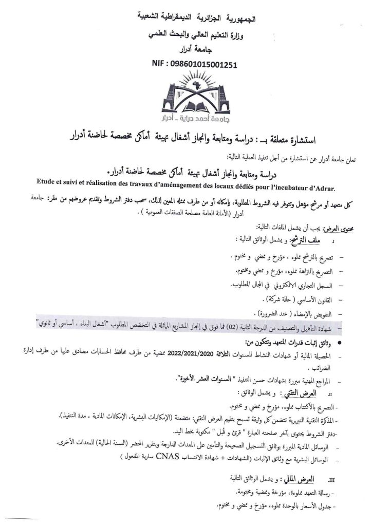 استشارة متعلقة ب : دراسة ومتابعة وإنجاز أشغال تهيئة أماكن مخصصة لحاضنة أدرار 1٬129 Share FacebookGoogle+البريد الإلكترونيTwitter