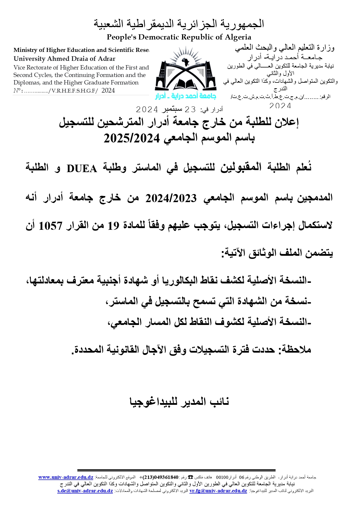 إعلان للطلبة من خارج جامعة أدرار المترشحين للتسجيل باسم الموسم الجامعي 2025/2024 & 3٬232 Share FacebookGoogle+البريد الإلكترونيTwitter