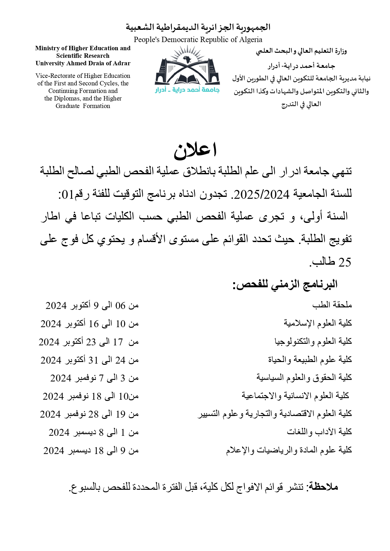 الإعلان عن انطلاق عملية الفحص الطبي لصالح طلبة السنة الأولى للسنة الجامعية 2025/2024 861 Share FacebookGoogle+البريد الإلكترونيTwitter