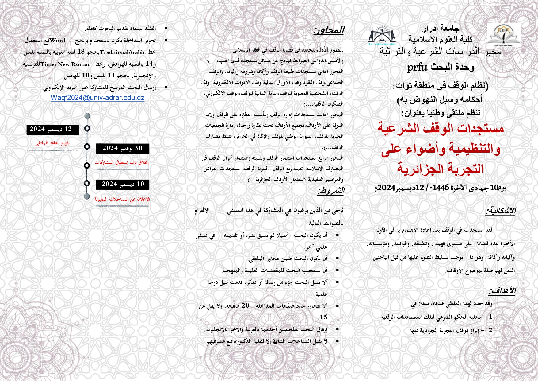الملتقى الوطني حول مستجدات الوقف الشرعية والتنظيمية وأضواء على التجربة الجزائرية يوم 10 جمادي الآخرة 1446ه / 12 ديسمبر 2024م لتحميل المطوية : مستجدات الوقف الشرعية والتنظيمية وأضواء على التجربة الجزائرية 1٬410 Share FacebookGoogle+البريد الإلكترونيTwitter