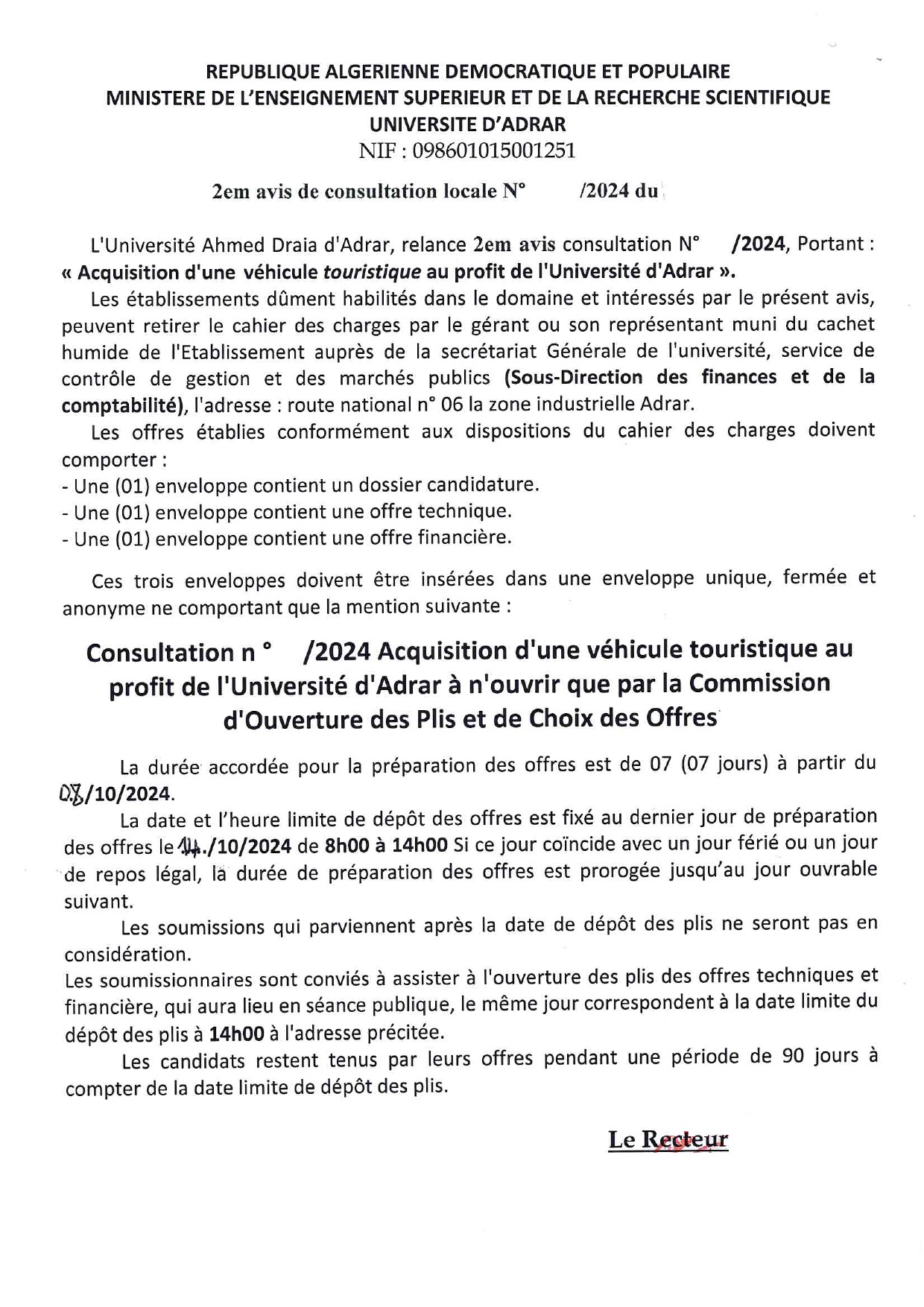 Relance 2em avis consultation N° /2024 , Portant: Acquisition d’une véhicule touristique au profilt de l’Université d’Adrar 709 Share FacebookGoogle+البريد الإلكترونيTwitter