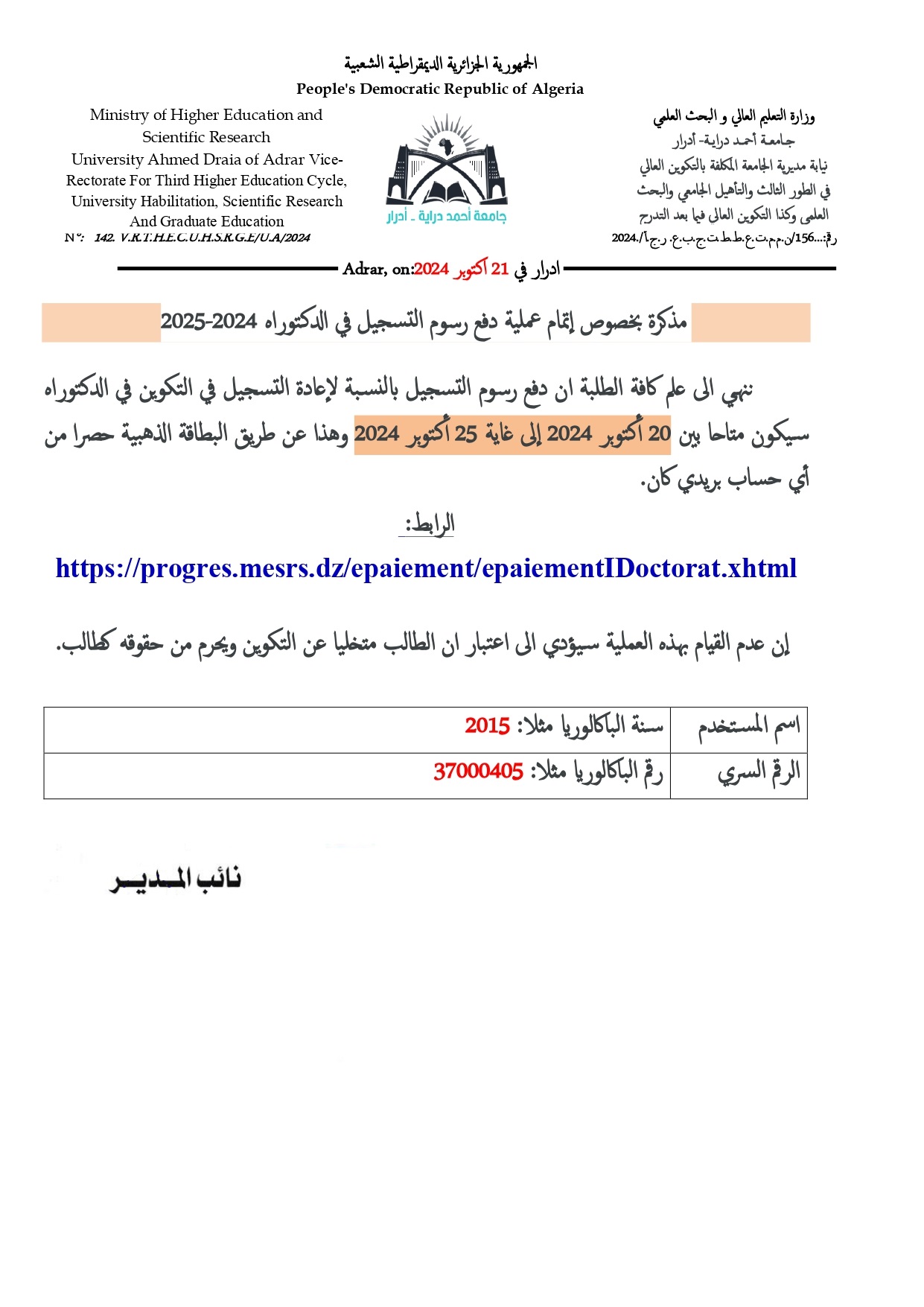 مذكرة بخصوص إتمام عملية دفع رسوم التسجيل في الدكتوراه 2024-2025 لدفع رسوم التسجيل عن طريق البطاقة الذهبية يرجى الضغط على الرابط التالي : https://progres.mesrs.dz/epaiement/epaiementIDoctorat.xhtml 1٬583 Share FacebookGoogle+البريد الإلكترونيTwitter