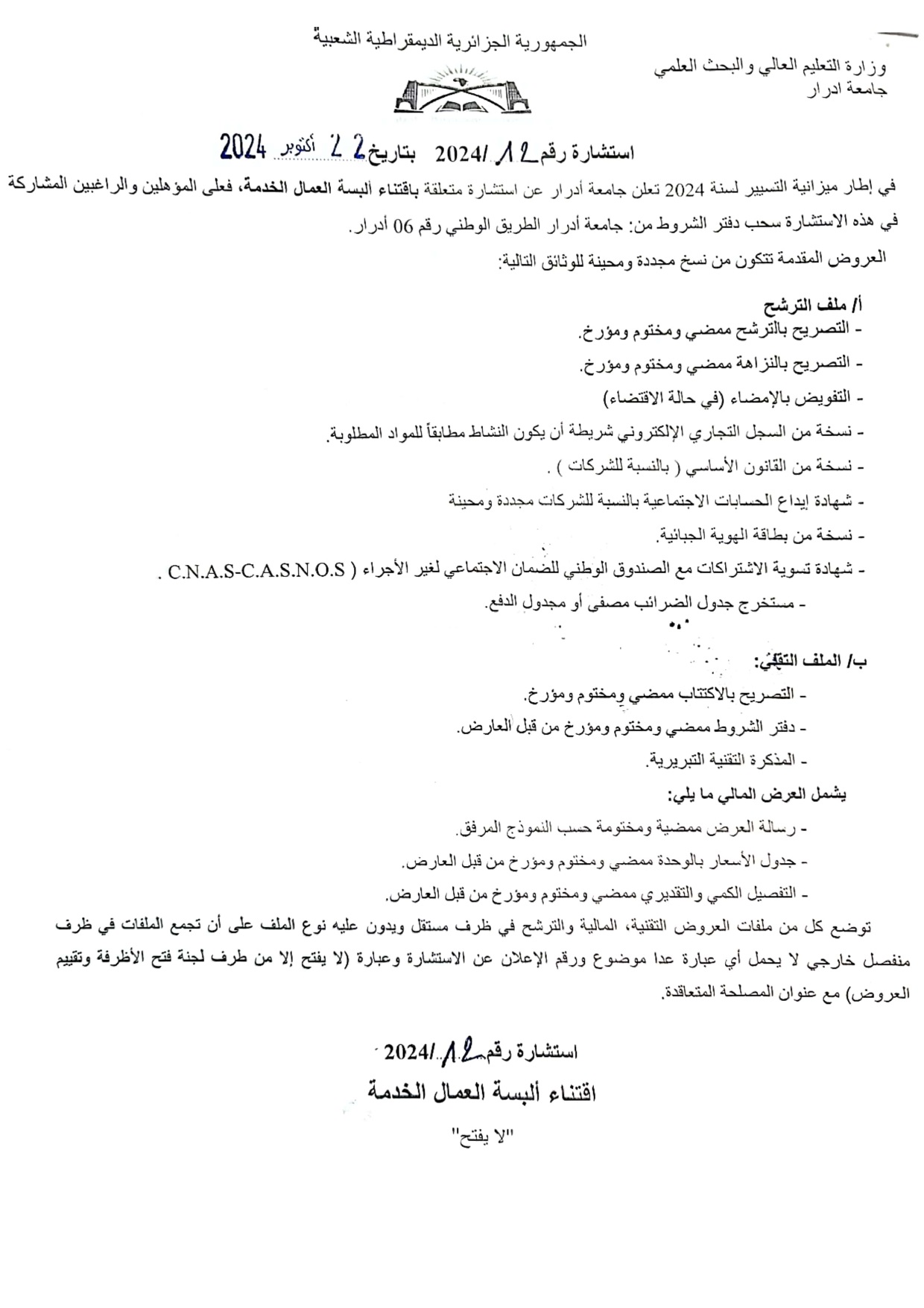 استشارة رقم 2024/12 المتعلقة باقتناء ألبسة لعمال الخدمة بجامعة أدرار لتحميل الاستشارة : استشارة متعلقة باقتناء ألبسة لعمال الخدمة بجامعة أدرار 645 Share FacebookGoogle+البريد الإلكترونيTwitter