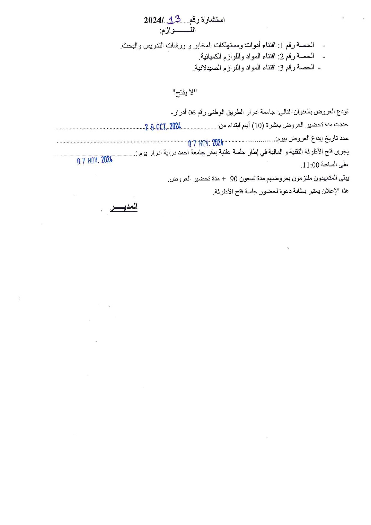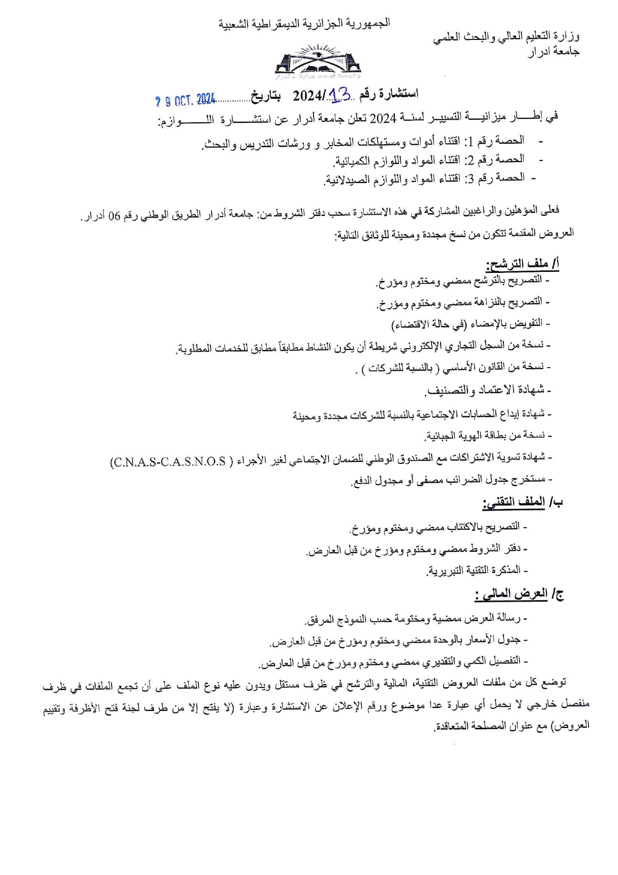 استشارة رقم 2024/13 المتعلقة باستشارة اللوازم لجامعة أدرار 701 Share FacebookGoogle+البريد الإلكترونيTwitter