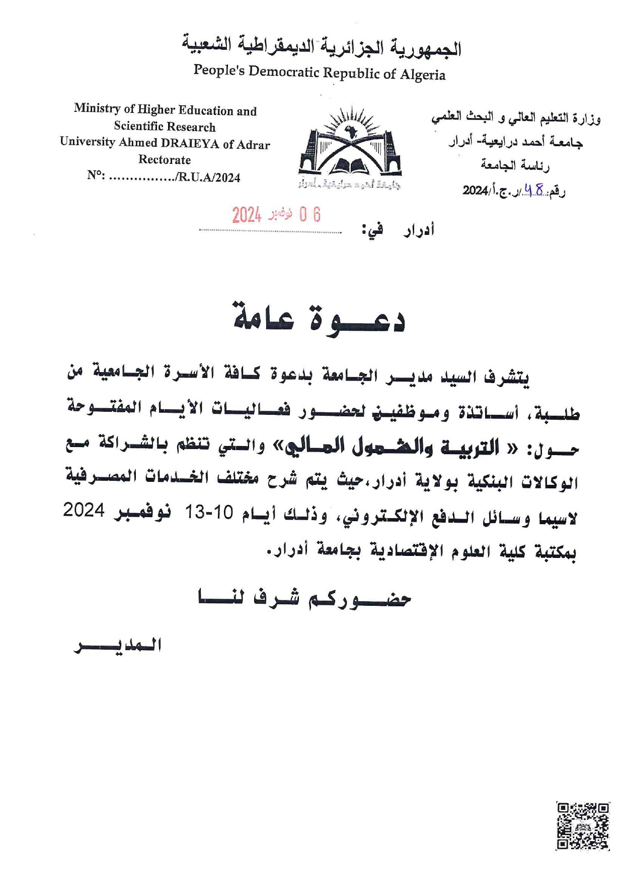 دعوة عامة لحضور فعاليات الأيام المفتوحة حول : التربية والشمول المالي 567 Share FacebookGoogle+البريد الإلكترونيTwitter
