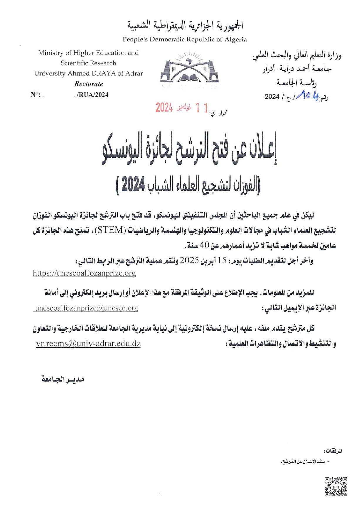 إعلان عن فتح الترشح لجائزة اليونسكو (الفوزان لتشجيع العلماء الشباب 2024) 497 Share FacebookGoogle+البريد الإلكترونيTwitter