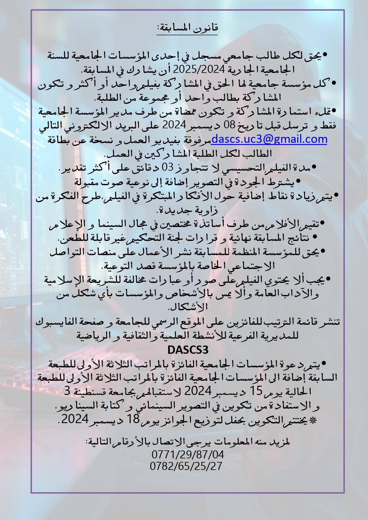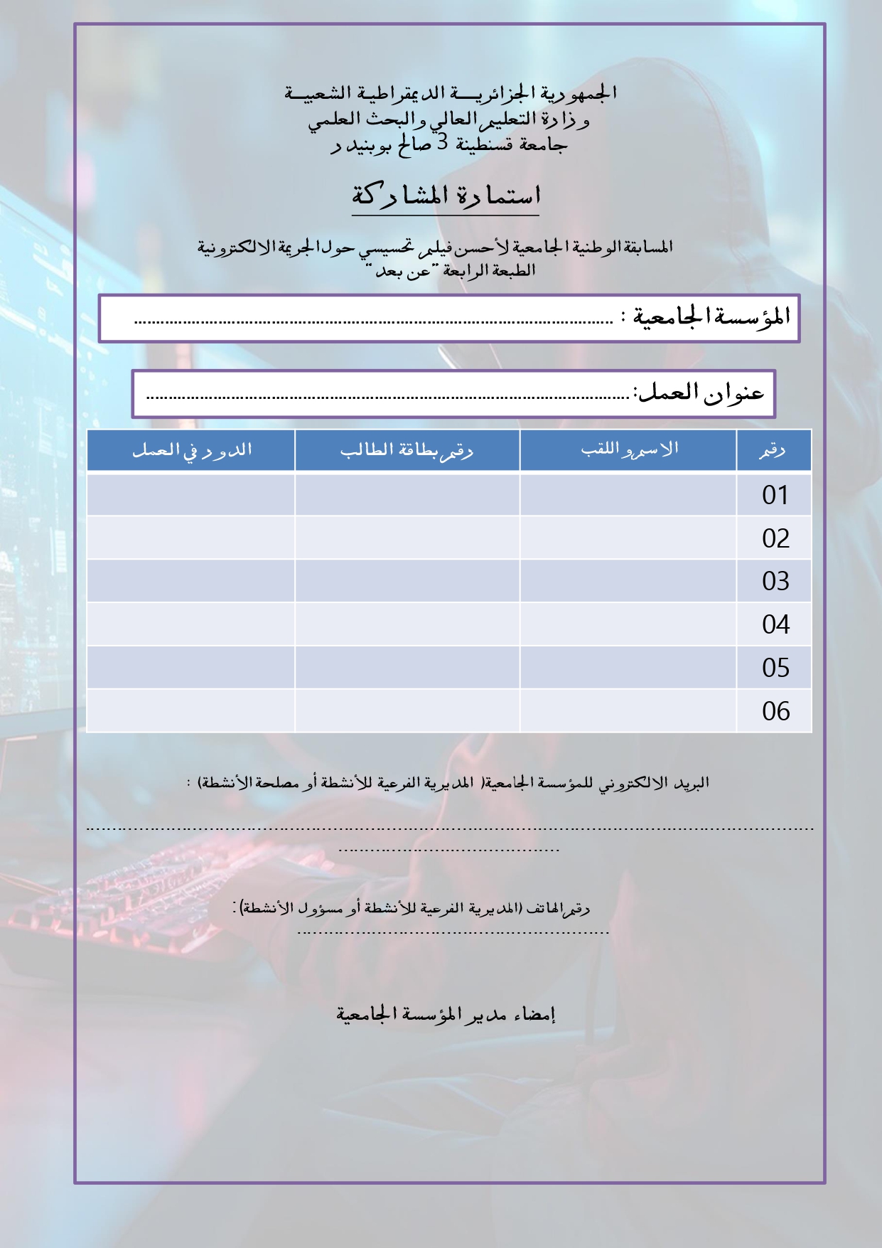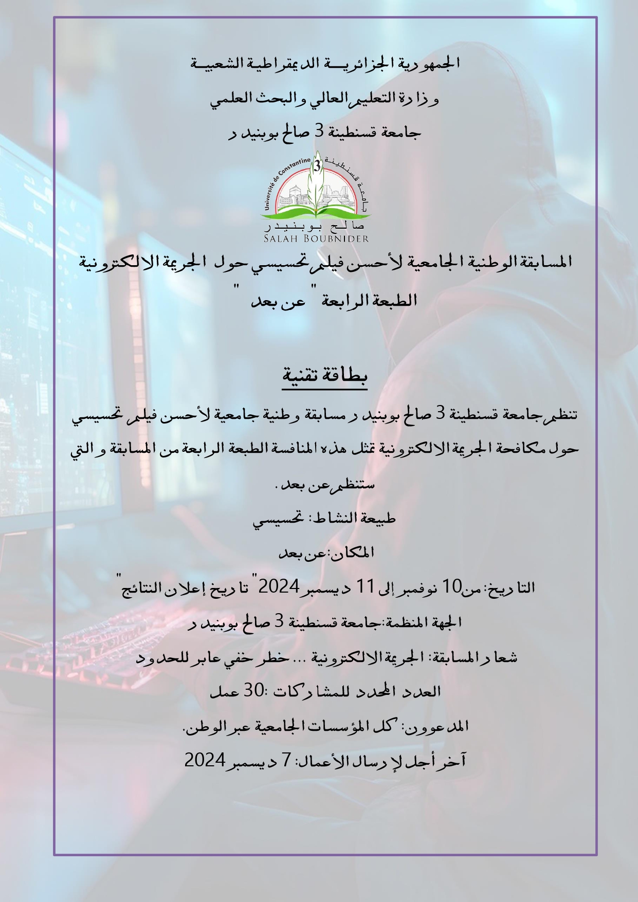 المسابقة الوطنية الجامعية لأحسن فيلم تحسيسي حول الجريمة الإلكترونية الطبعة الرابعة (4) للتحميل : البطاقة التقنية للفيلم التحسيسي حول الجريمة الإلكترونية 890 Share FacebookGoogle+البريد الإلكترونيTwitter