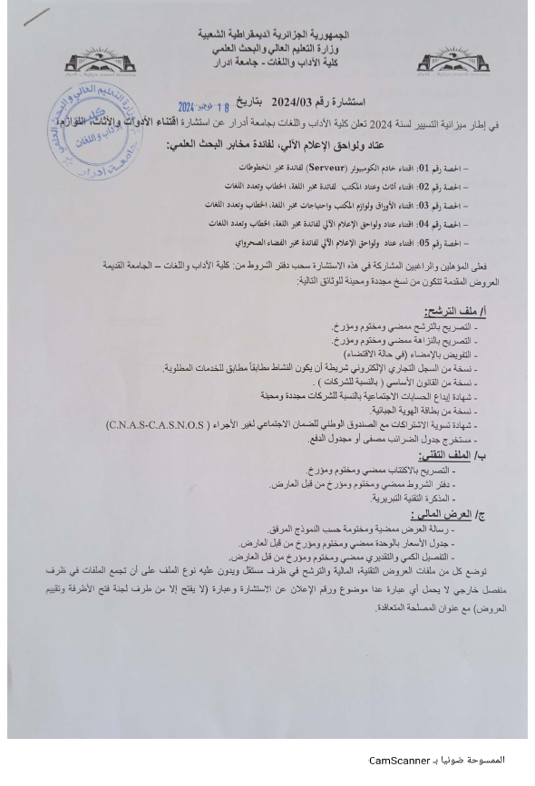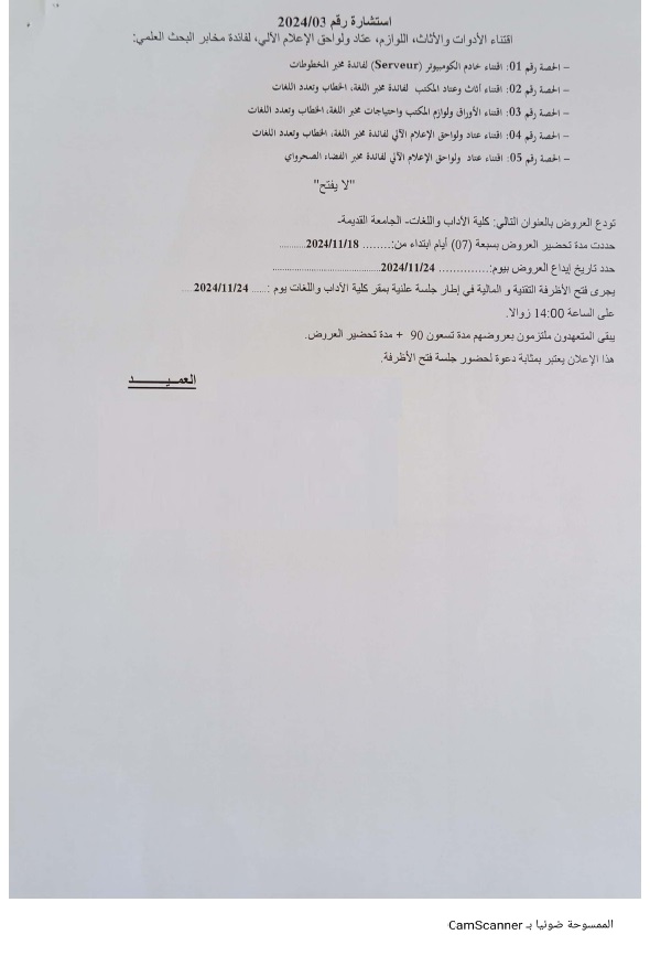 استشارة رقم 2024/03 المتعلقة باقتناء الأدوات والأثاث, اللوازم, عتاد ولواحق الإعلام الآلي, لفائدة مخابر البحث العلمي كلية الآداب واللغات 1٬032 Share FacebookGoogle+البريد الإلكترونيTwitter