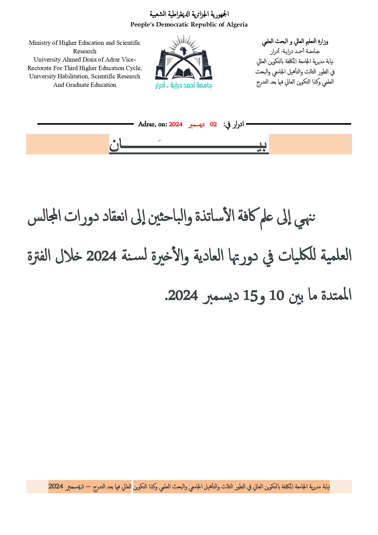 جامعة أحمد دراية - جامعة أحمد درايعية بأدرار هي جامعة جزائرية حكومية تسعى إلى بناء مجتمع معرفي تنافسي من خلال بيئة تعليمية متطورة، وبحوث علمية، ومبادرات وشراكات مجتمعية فاعلة، تحتوي على 8 كليات بالإضافة الى ملحقة الطب