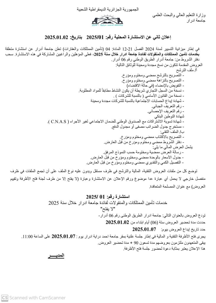 استشارة رقم 2025/12 المتعلقة بصيانة التجهيزات العلمية وأجهزة الإعلام الآلي والات…