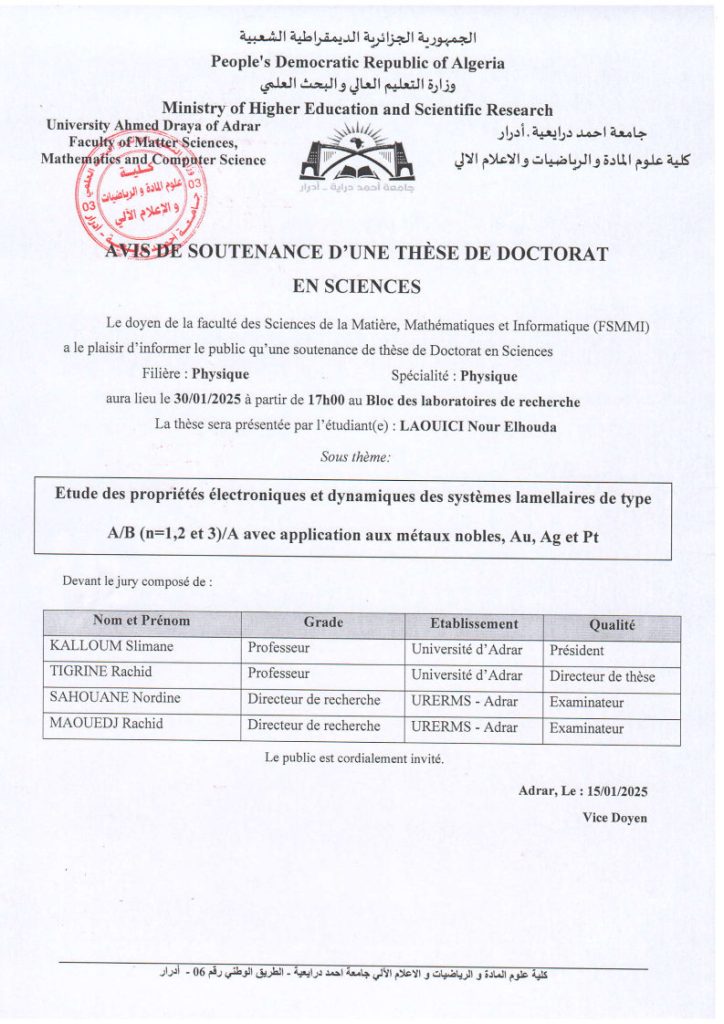 Etude des propriétés électroniques et dynamiques des systèmes lamellaires de type A/B (n=1,2 et 3)/A avec application aux métaux nobles, Au, Ag et Pt 294 Share FacebookGoogle+البريد الإلكترونيTwitter