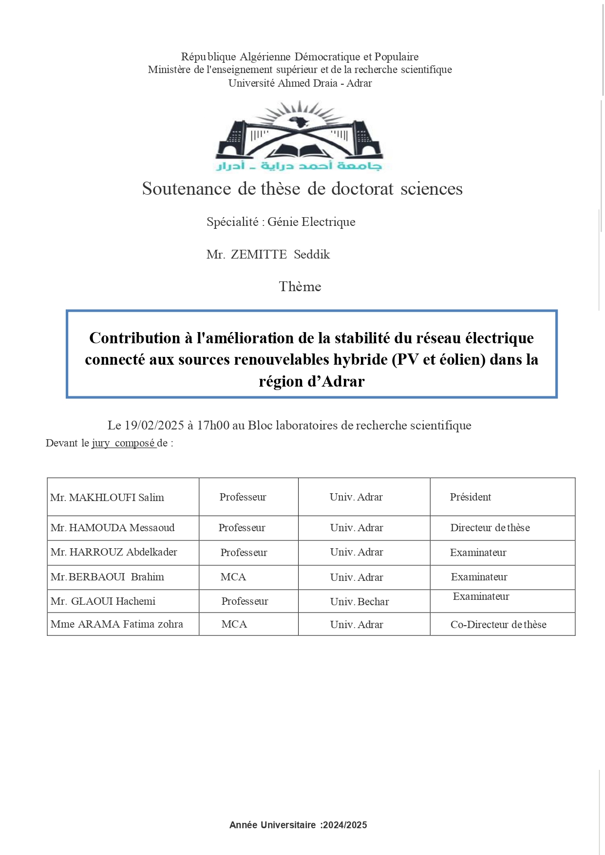 Contribution à l’amélioration de la stabilité du réseau électrique connecté aux sources renouvelables hybride (PV et éolien) dans la région d’Adrar 545 Share FacebookGoogle+البريد الإلكترونيTwitter