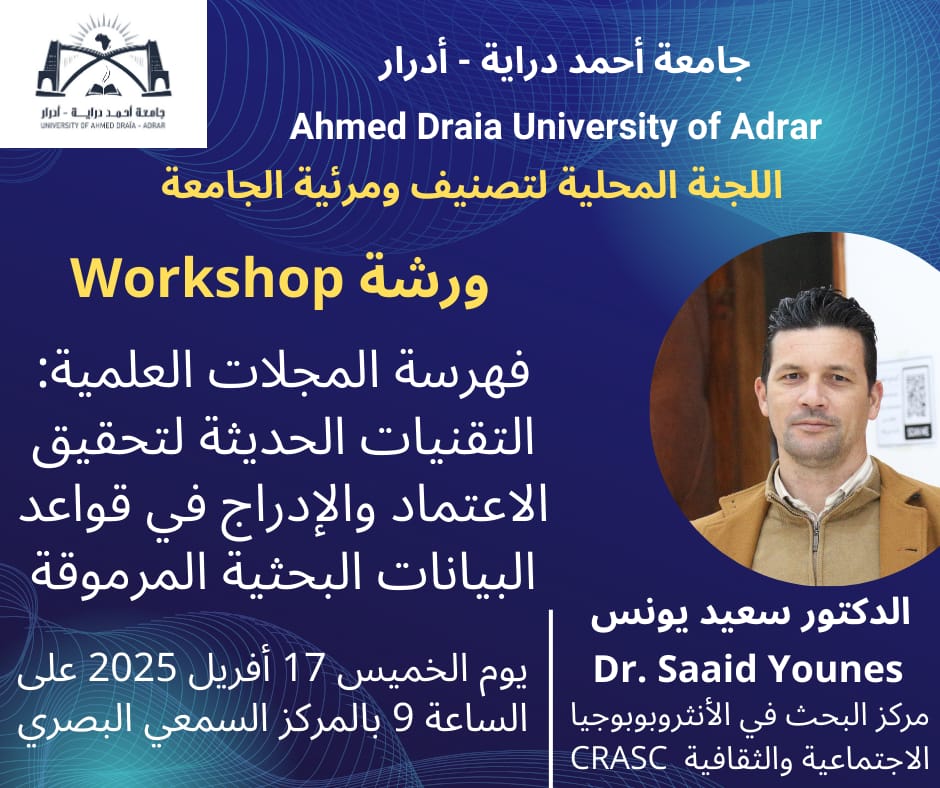 تنظّم اللجنة المحلية لتصنيف ومرئية جامعة أحمد دراية – أدرار، ورشة عمل بعنوان: