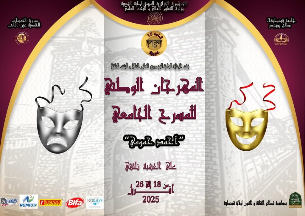 تجسيدا للبرنامج السنوي(2023 -2024)، المتعلق بالأنشطة العلمية والثقافية الذي سطرته مديرية الحياة الطلابية بالتنسيق مع الديوان الوطني للخدمات الجامعية، نظمت جامعة قسنطينة3 صالح بوبنيدر، ومديرية الخدمات الجامعية عين الباي، فعاليات الطبعة 15 من المهرجان الوطني للمسرح الجامعي أحمد حمومي، في الفترة الممتدة من 18 إلى 24 أفريل 2025 ، تحت شعار”على الخشبة نلتقي”.