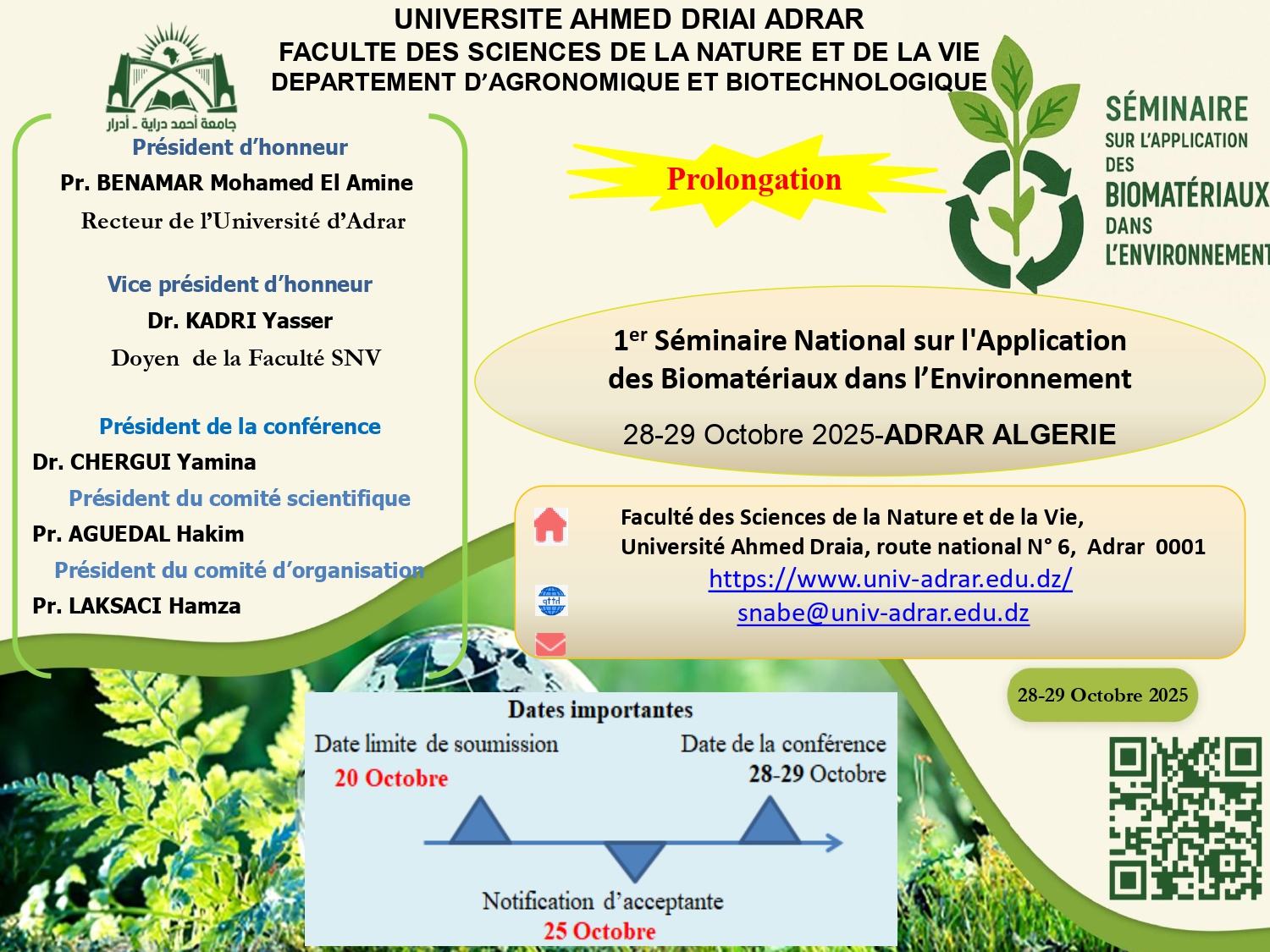 Séminaire National sur l’Application des Biomatériaux dans L’environnement Pour télécharger : Séminaire National sur l’Application des Biomatériaux dans L’environnement (EN) 3٬026 Share FacebookGoogle+البريد الإلكترونيTwitter