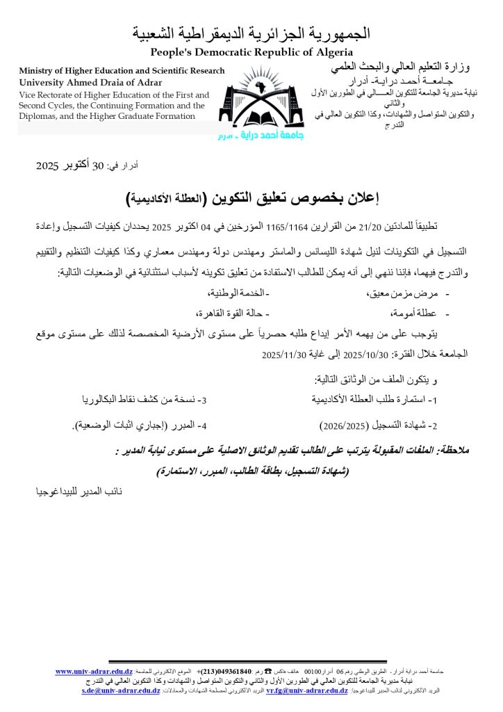 إعلان بخصوص تعليق التكوين (العطلة الأكاديمية) تحميل استمارة طلب عطلة أكاديمية للتسجيل : لتسجيل الطلب على مستوى الأرضية يرجى الضغط على : طلب عطلة أكاديمية 157 Share FacebookGoogle+البريد الإلكترونيTwitter