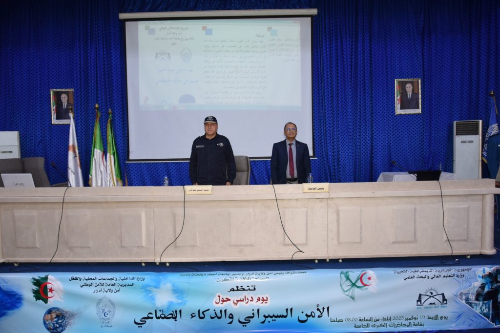 تفعيلا للشراكة بين المؤسسات الأمنية والأكاديمية، نظمت مديرية الأمن الوطني بولاية أدرار، بالتنسيق مع جامعة أحمد دراية، يوما دراسيا بعنوان “الأمن السيبراني والذكاء الاصطناعي”. هذه التظاهرة العلمية التئمت يوم الأربعاء 19 نوفمبر 2025 بقاعة المحاضرات الكبرى للجامعة، بهدف رفع مستوى الوعي بالتحديات الرقمية واستشراف سبل بناء السيادة الرقمية للجزائر في ظل التحولات التكنولوجية المتسارعة.