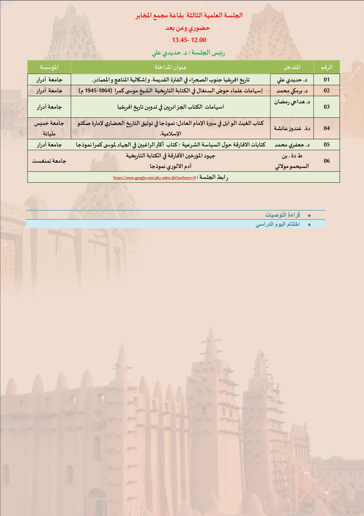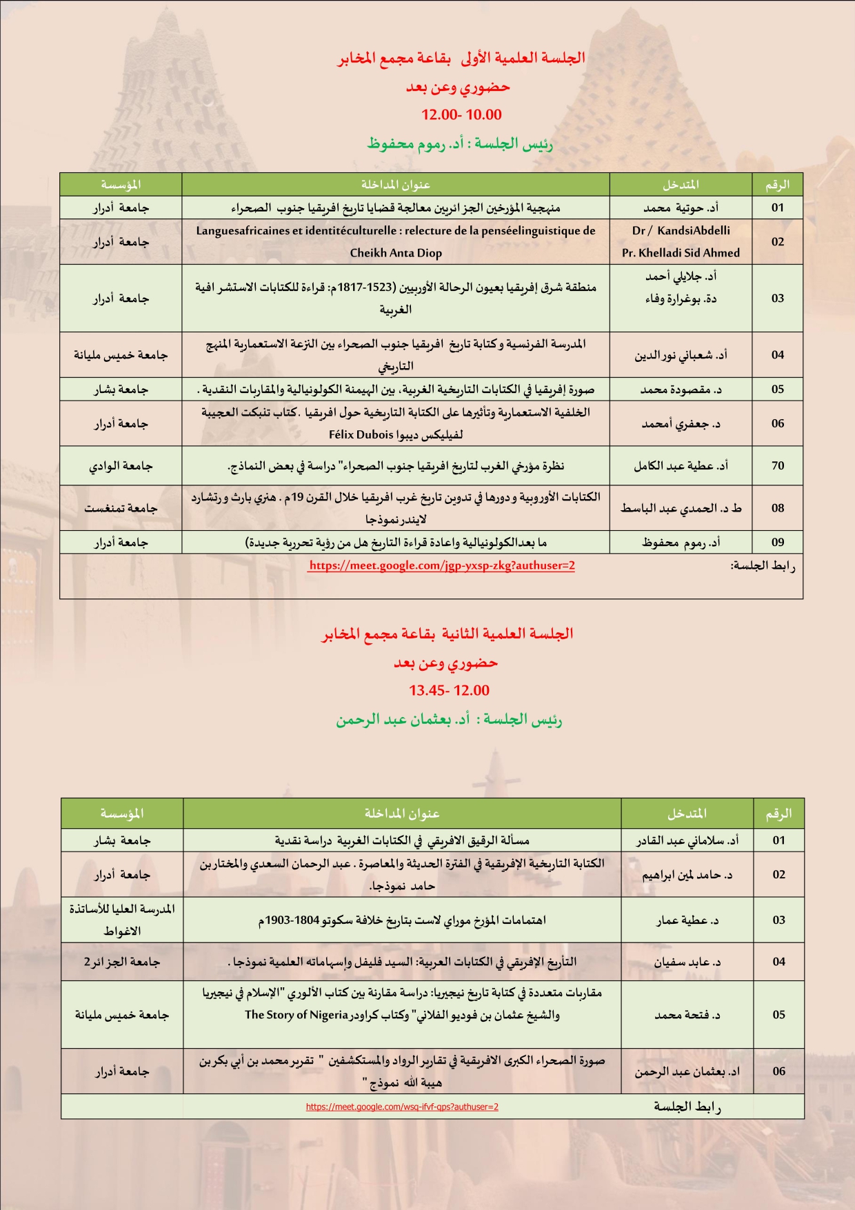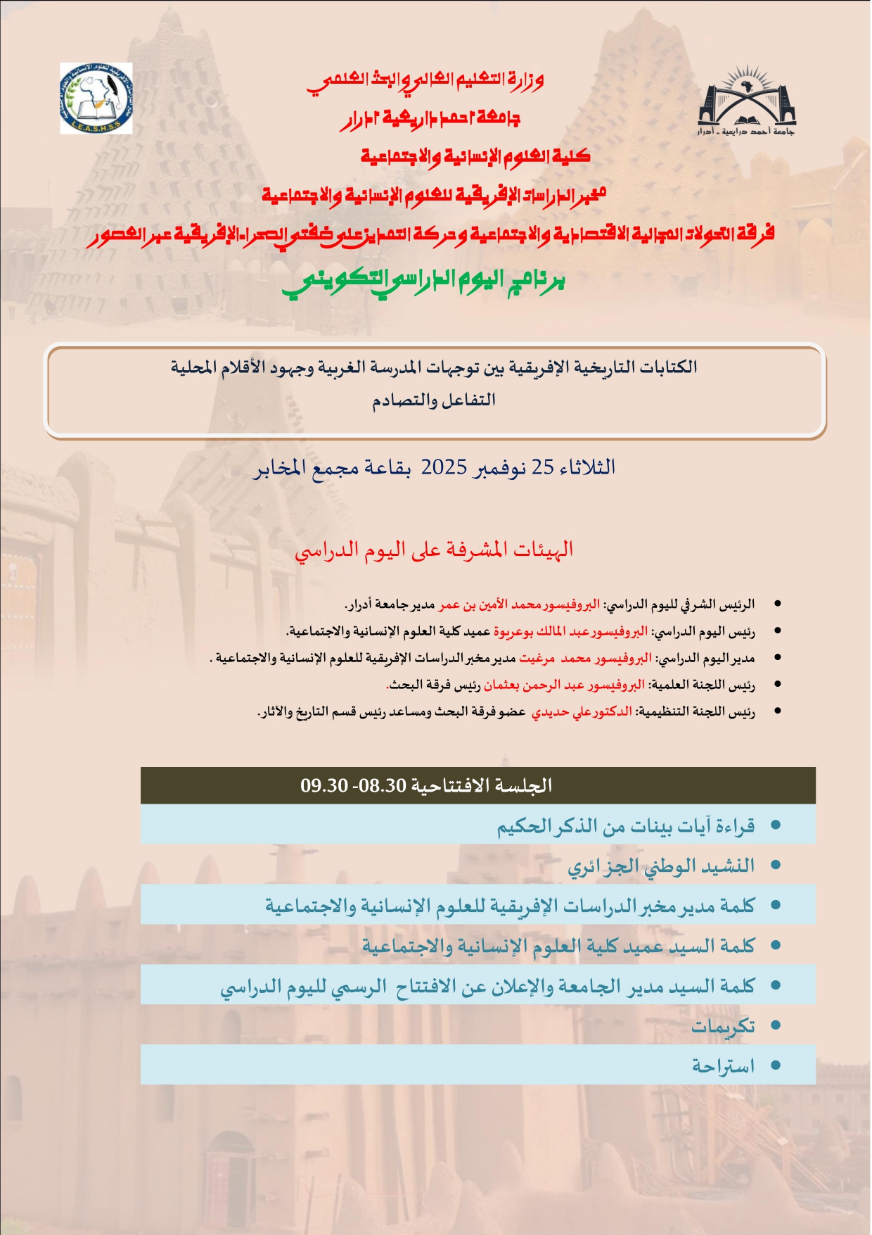 اليوم الدراسي التكويني حول الكتابات التاريخية الإفريقية بين توجيهات المدرسة الغربية وجهود الأقلام المحلية التفاعل والتصادم الثلاثاء 25 نوفمبر 2025 بقاعة مجمع المخابر 26 Share FacebookGoogle+البريد الإلكترونيTwitter