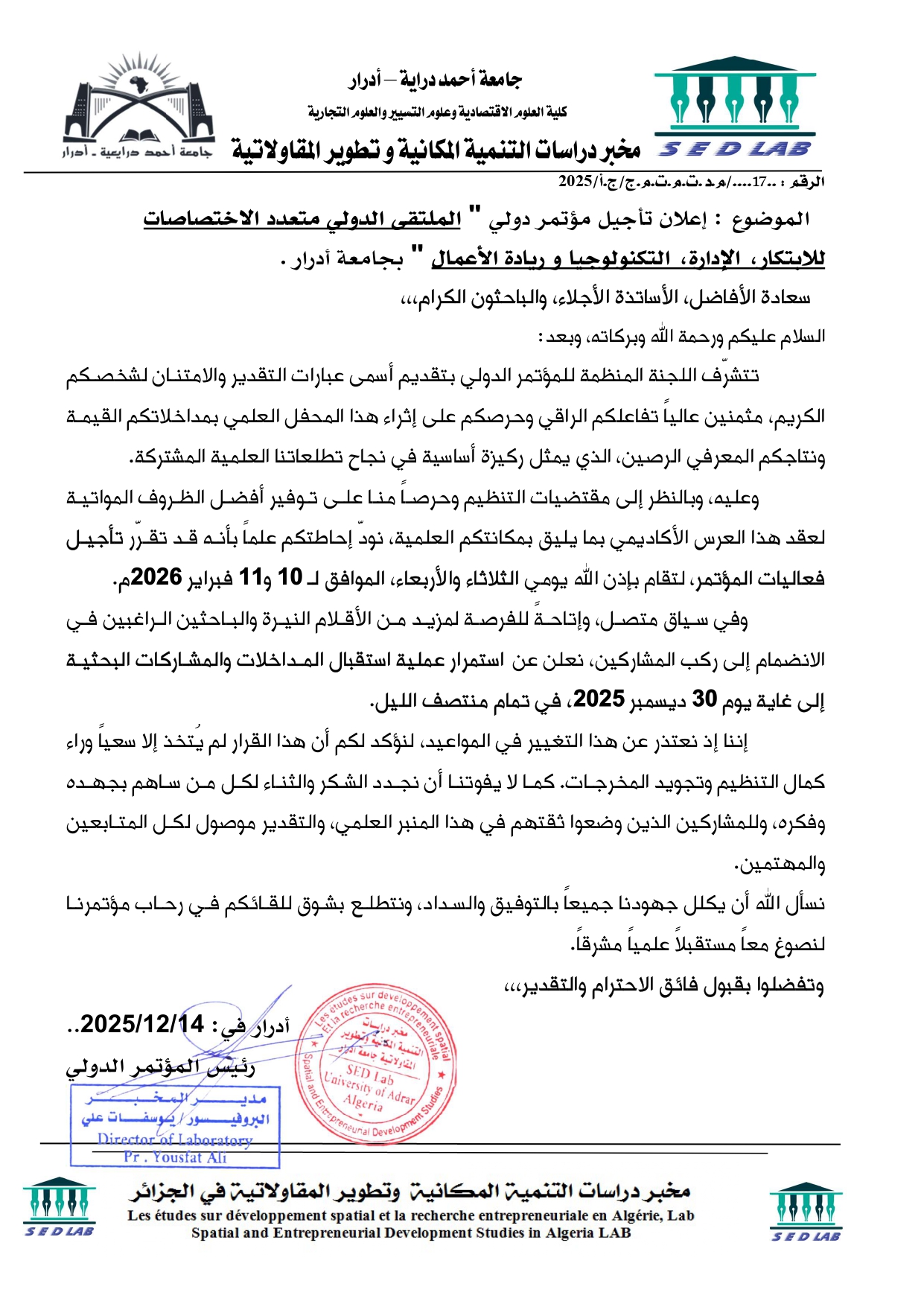 تأجيل الملتقى الدولي متعدد الاختصاصات حول الابتكار ،الإدارة ، التكنولوجيا و ريادة الأعمال بجامعة أدرار 634 Share FacebookGoogle+البريد الإلكترونيTwitter