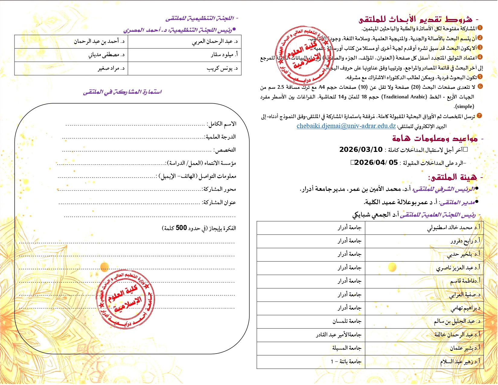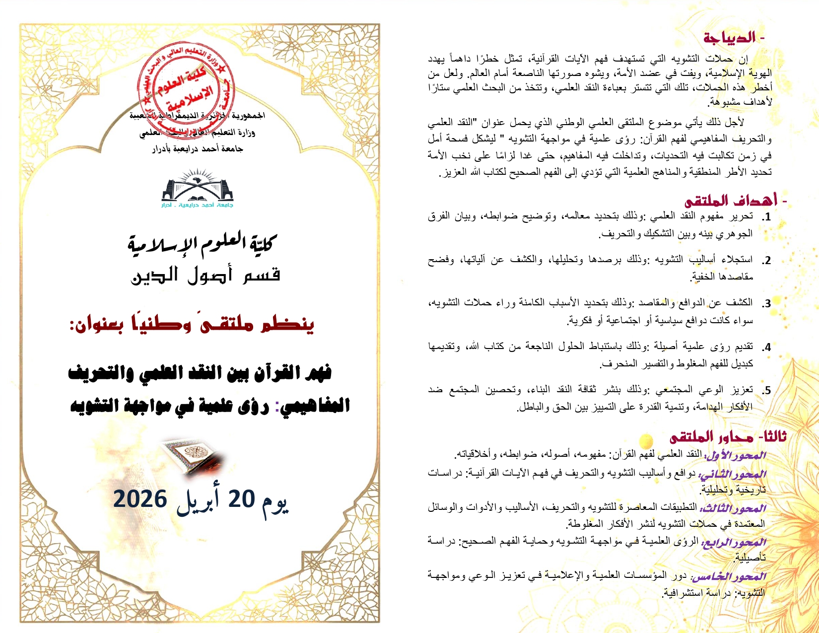 الملتقى الوطني حول فهم القرآن بين النقد العلمي والتحريف المفاهيمي : رؤى علمية في مواجهة التشويه يوم 20 أبريل 2026 لتحميل مطوية الملتقى : الملتقى الوطني حول فهم القرآن بين النقد العلمي والتحريف المفاهيمي : رؤى علمية في مواجهة التشويه 553 Share FacebookGoogle+البريد الإلكترونيTwitter