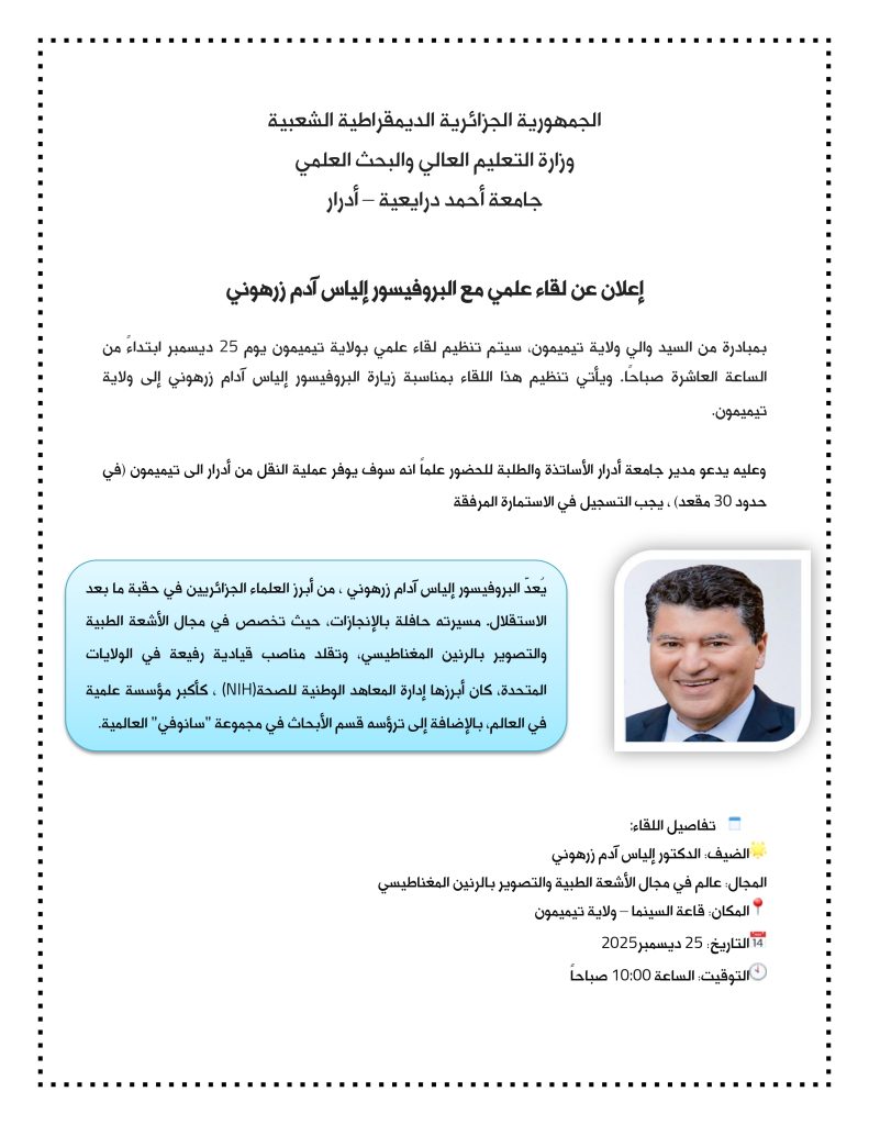 إعلان عن لقاء علمي مع البروفيسور إلياس آدم زرهوني استمارة التسجيل 24 Share FacebookGoogle+البريد الإلكترونيTwitter