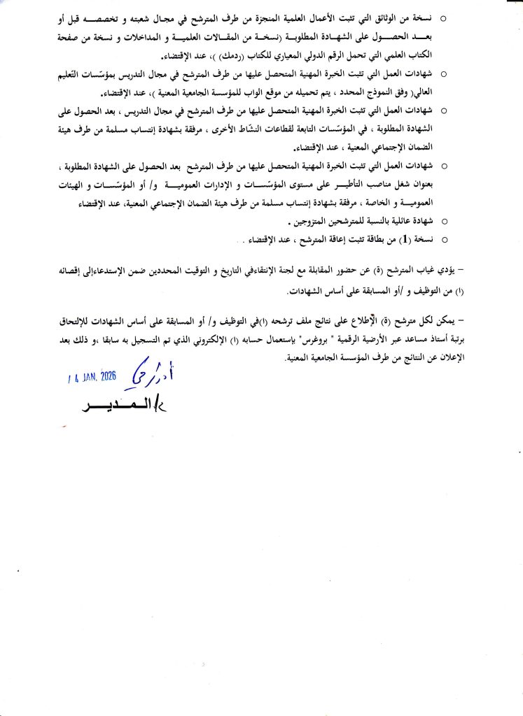 حيث يحدد أجل التسجيلات للتوظيف و / أو المسابقة على أساس الشهادات بخمسة عشرة (15) يوم عمل، ابتداء من 18 يناير 2026 إلى غاية 05 فيفري2026