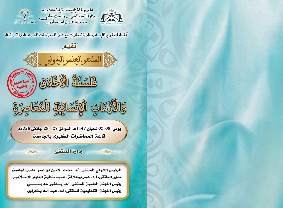 الملتقى العلمي الدولي حول فلسفة الأخلاق والأزمات الإنسانية المعاصرة يومي 08-09 شعبان 1447ه الموافق 27-28 جانفي 2026م بقاعة المحاضرات الكبرى بالجامعة لتحميل جدول الجلسات العلمية للملتقى الدولي : الملتقى العلمي الدولي حول فلسفة الأخلاق والأزمات الإنسانية المعاصرة 15 Share FacebookGoogle+البريد الإلكترونيTwitter
