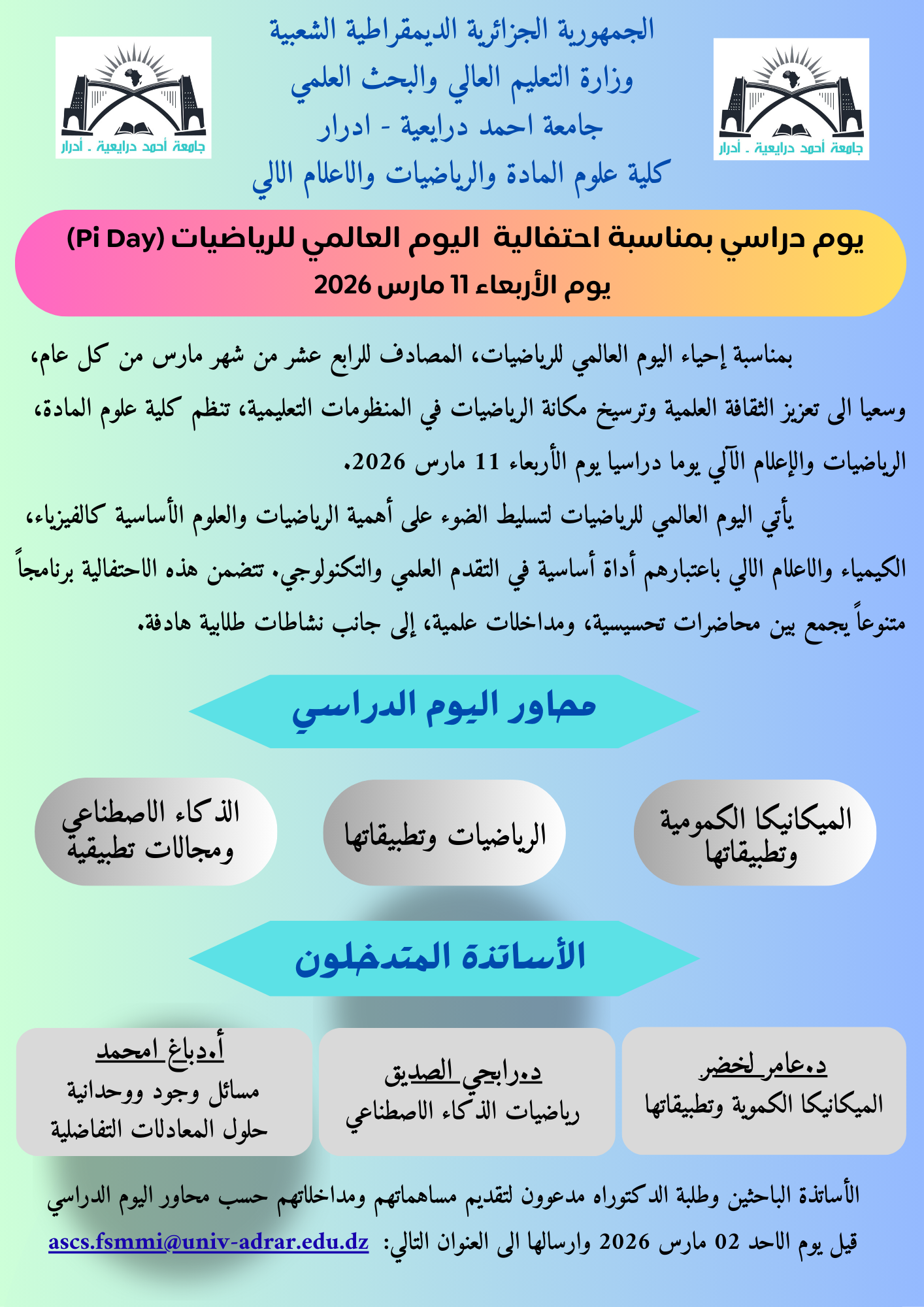 يوم دراسي بمناسبة احتفالية اليوم العالمي للرياضيات (Pi Day) يوم الأربعاء 11 مارس 2026 17 Share FacebookGoogle+البريد الإلكترونيTwitter