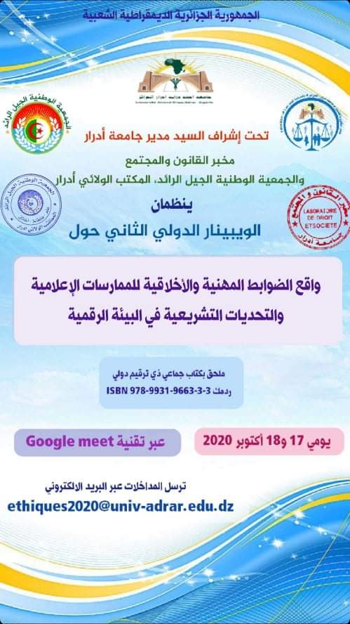 الويبينار الدولي الثاني حول: واقِعُ الضَّوابِطِ اَلْمِهْنيَّةِ والْأَخْلاقيَّةِ لِلْمُمَارَسَاتِ الإِعْلاميَّةِ والتَّحَدّياتِ التَّشْريعيَّةِ فِي البيئَةِ الرَّقْميَّةِ مطوية الويبينار الدولي الثاني حول: واقِعُ الضَّوابِطِ اَلْمِهْنيَّةِ والْأَخْلاقيَّةِ لِلْمُمَارَسَاتِ الإِعْلاميَّةِ والتَّحَدّياتِ التَّشْريعيَّةِ فِي البيئَةِ الرَّقْميَّةِ 1٬608 Share FacebookGoogle+البريد الإلكترونيTwitter