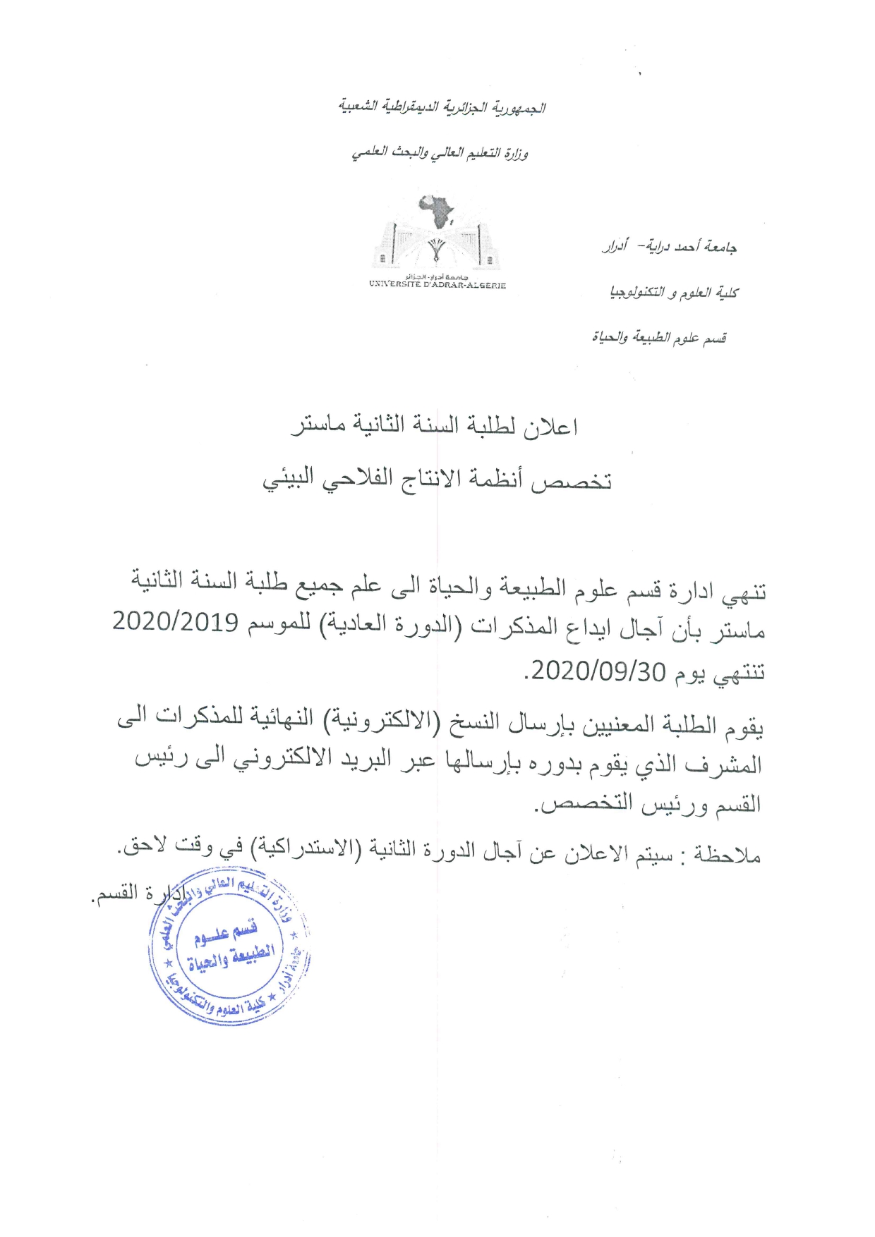 إعلان لطلبة السنة الثانية ماستر تخصص أنظمة الانتاج الفلاحي البيئي 1٬039 Share FacebookGoogle+البريد الإلكترونيTwitter