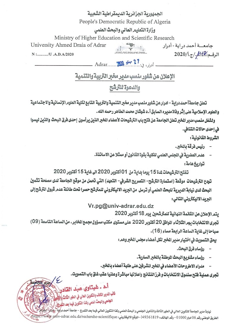الإعلان عن شغور منصب مدير مخبر التربية والتنمية والدعوة للترشح تحميل استمارة الترشح لمنصب مدير مخبر التربية والتنمية 2٬553 Share FacebookGoogle+البريد الإلكترونيTwitter