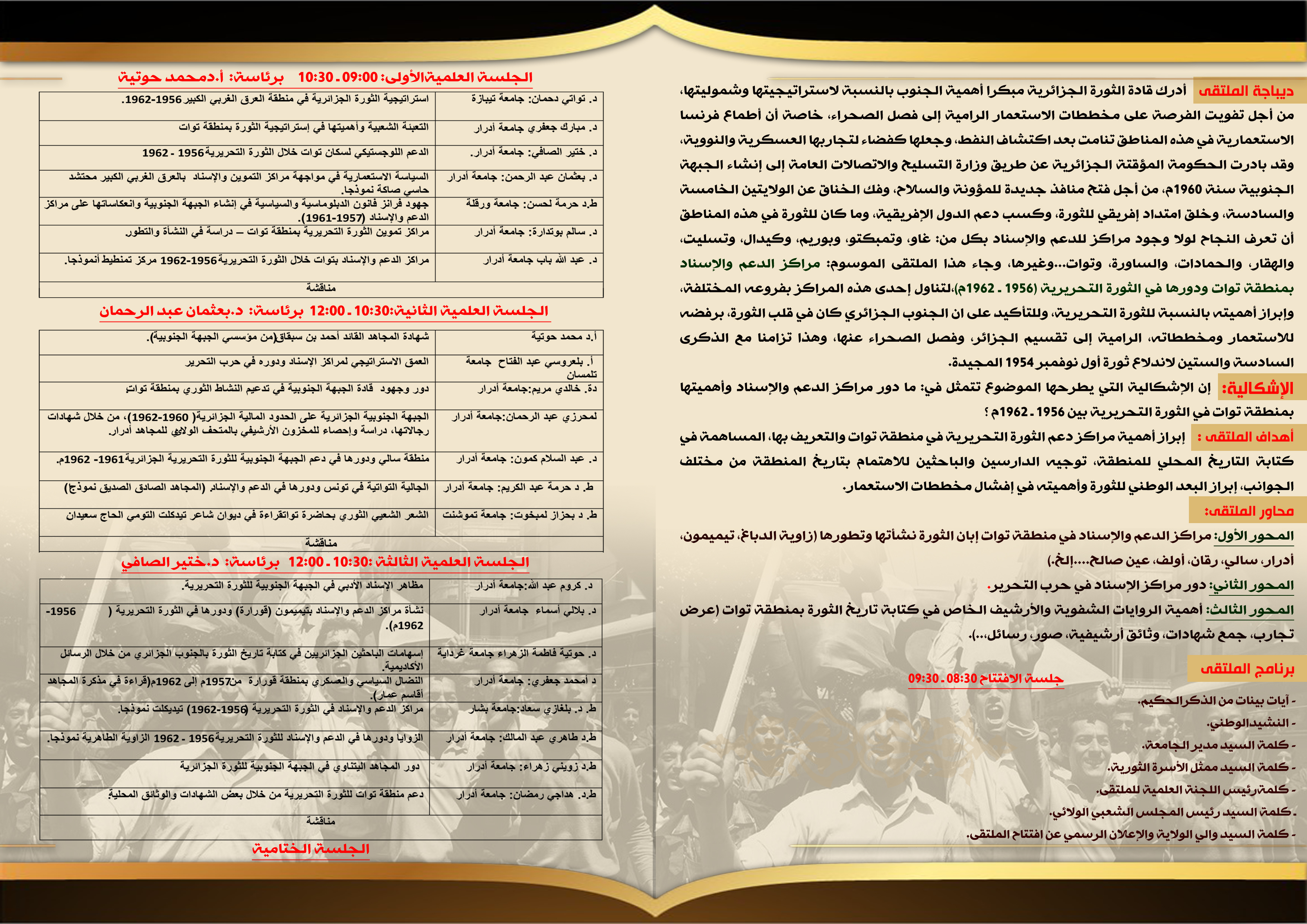 مراكز الدعم والإسناد بمنطقة توات ودورها في الثورة التحريرية (1956 ـ 1962م) يوم السبت 31 أكتوبر 2020 بجامعة ـ أدرار