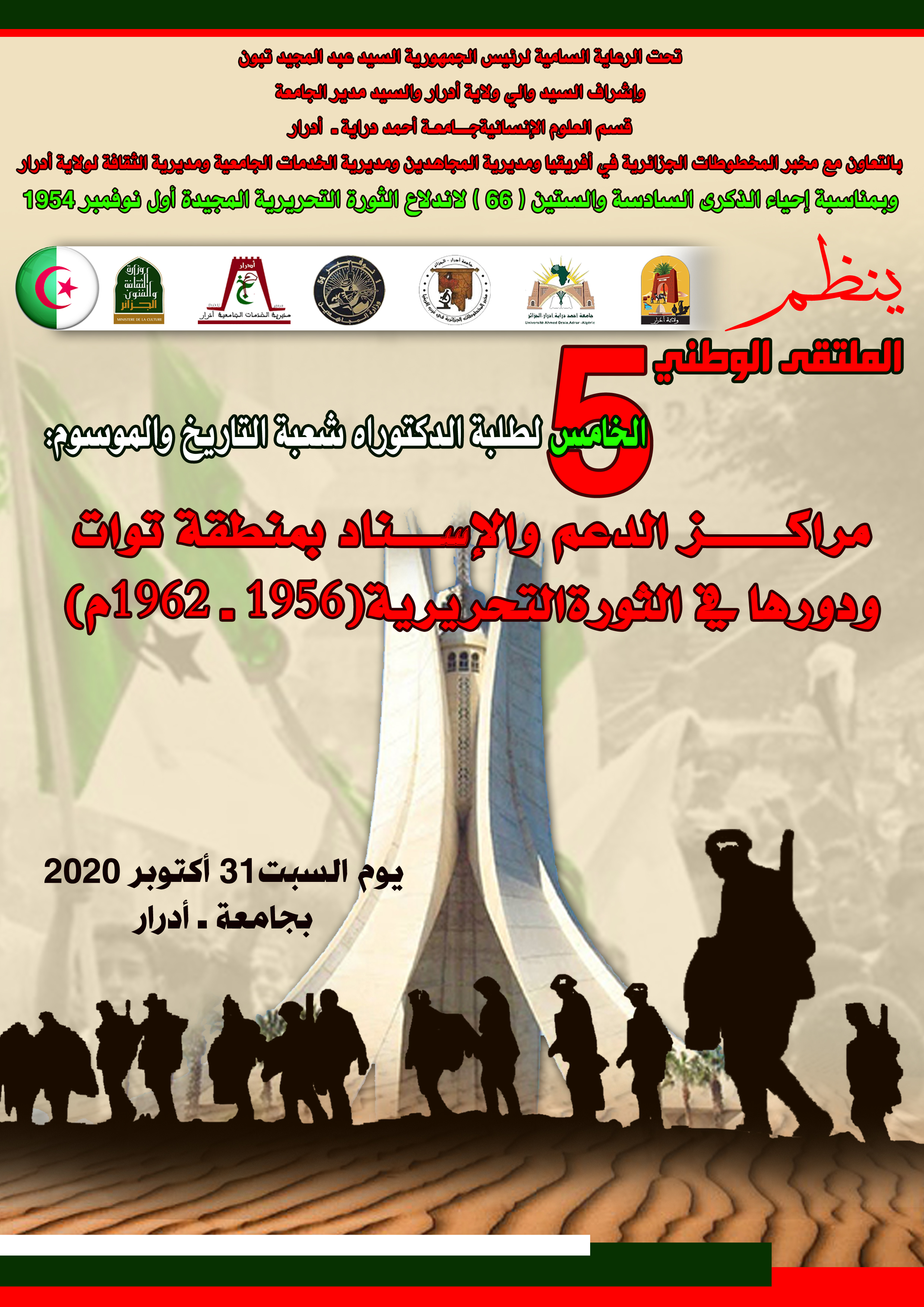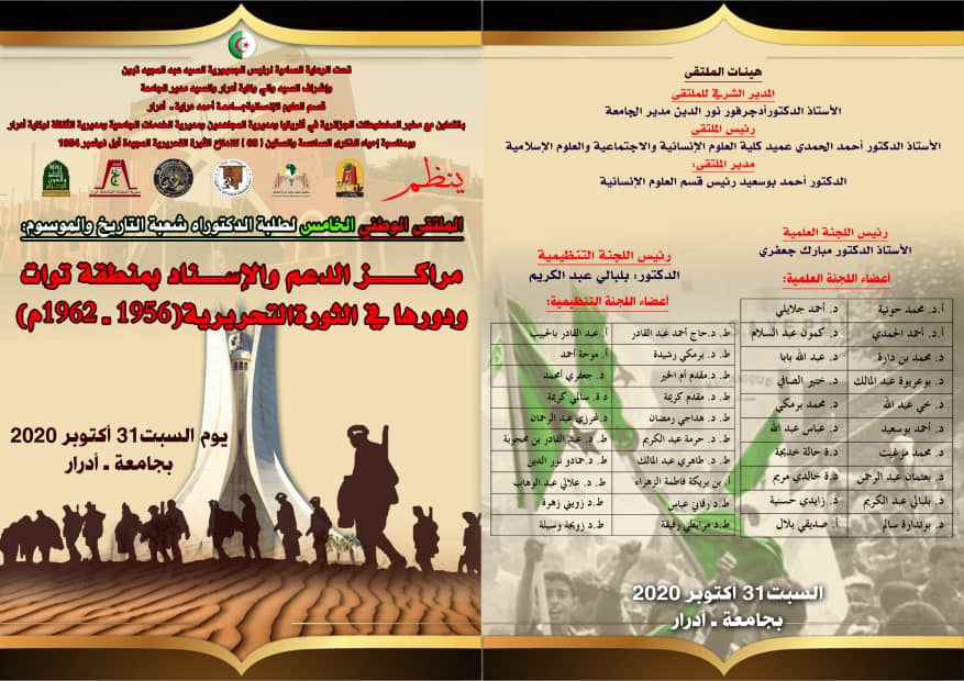 مراكز الدعم والإسناد بمنطقة توات ودورها في الثورة التحريرية (1956 ـ 1962م) يوم السبت 31 أكتوبر 2020 بجامعة ـ أدرار