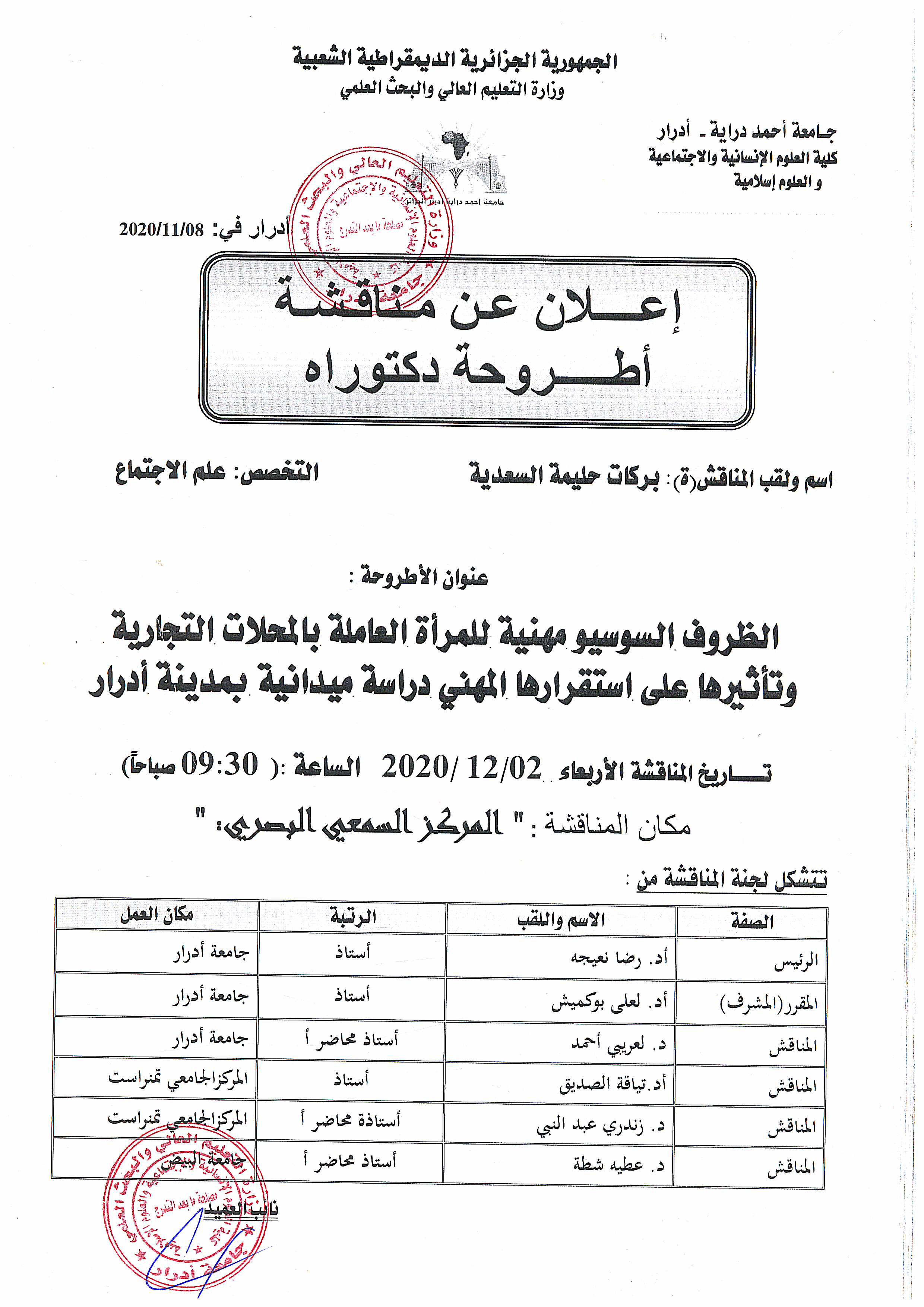 الظروف السوسيو مهنية للمرأة العاملة بالمحلات التجارية وتأثيرها على استقرارها المهني دراسة ميدانية بمدينة أدرار 764 Share FacebookGoogle+البريد الإلكترونيTwitter