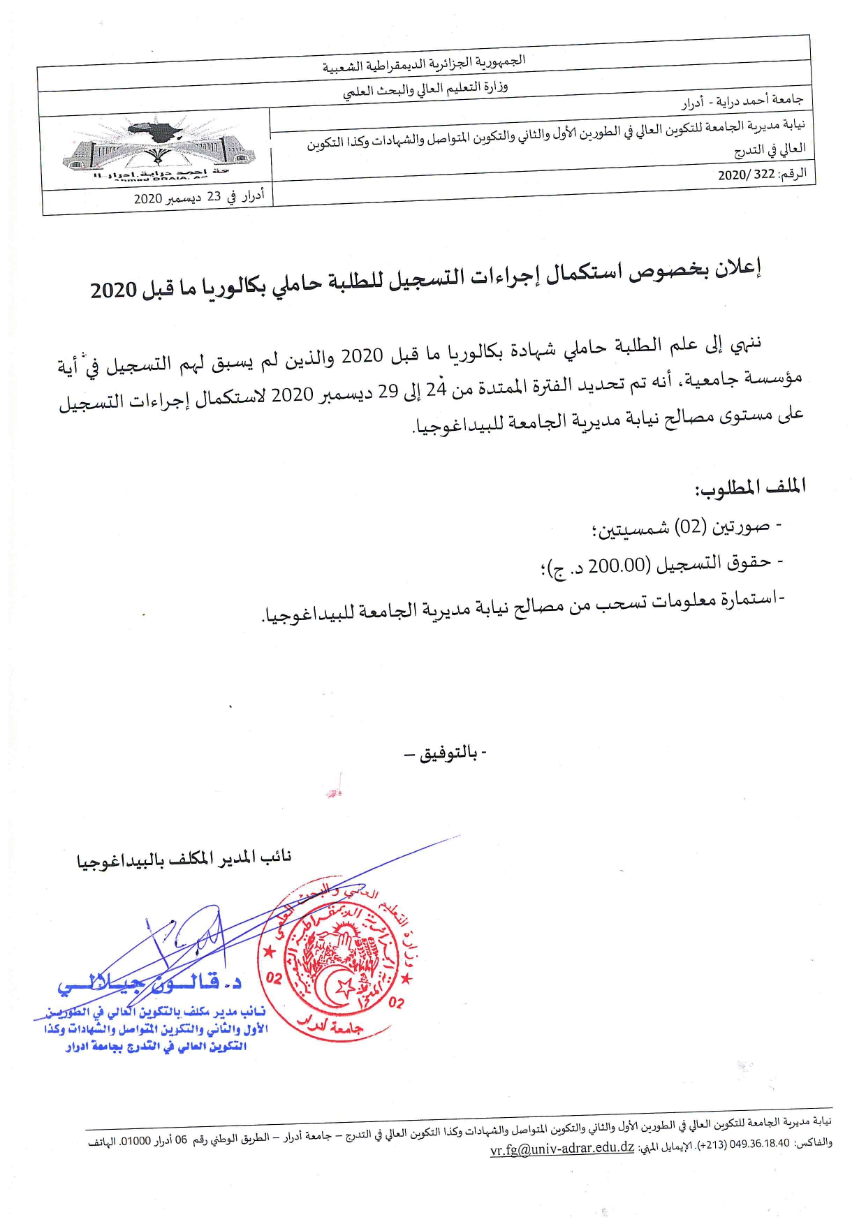 إعلان بخصوص استكمال إجراءات التسجيل للطلبة حاملي بكالوريا ما قبل 2020 1٬047 Share FacebookGoogle+البريد الإلكترونيTwitter