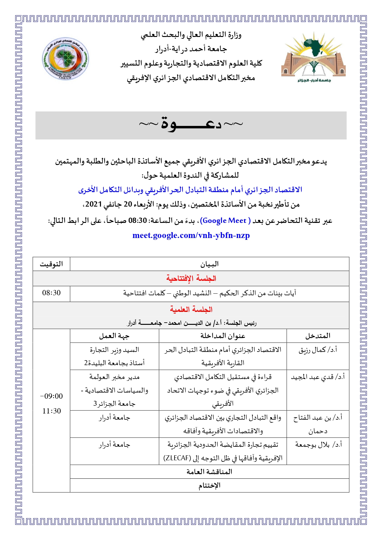 الندوة العلمية حول: الاقتصاد الجزائري أمام منطقة التبادل الحر الأفريقي وبدائل التكامل الآخرى
