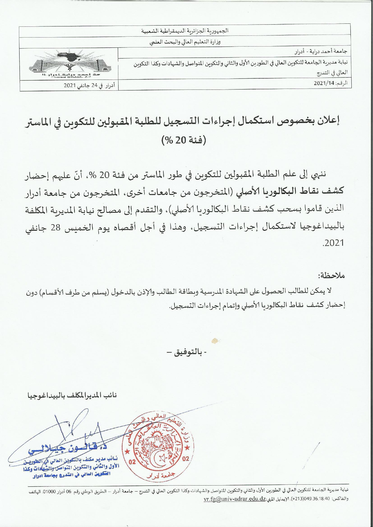إعلان بخصوص استكمال إجراءات التسجيل للطلبة المقبولين للتكوين في الماستر من فئة 20 % 1٬654 Share FacebookGoogle+البريد الإلكترونيTwitter